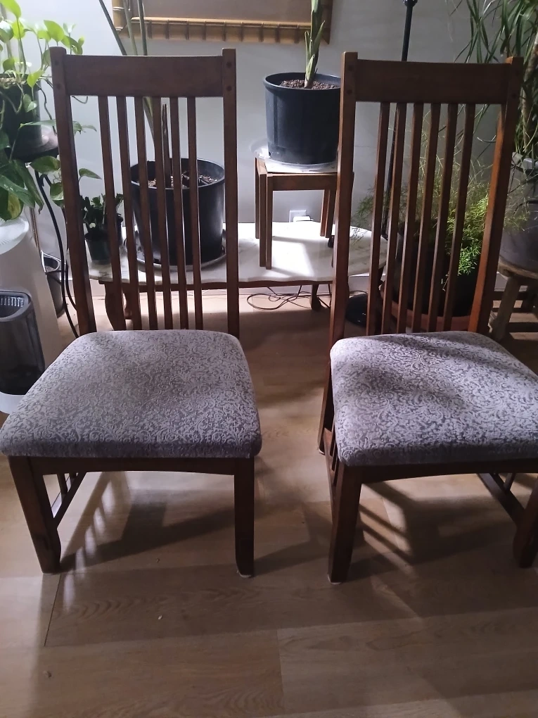 Selling a set of 4 wooden dining chairs. They feature a classic design with a patterned seat cushion. Perfect for adding a touch of warmth to your dining area! Can be sold as 2 or, 4, chairs for $25.00 each.