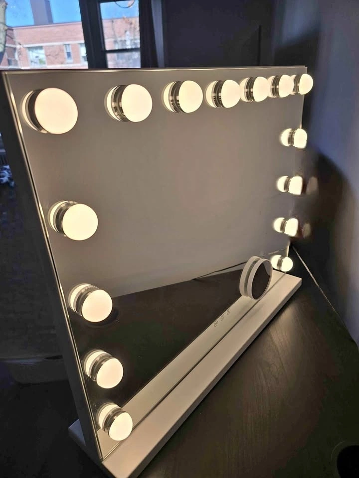 Upgraded vanity mirror with 15 LED bulbs and three adjustable light colors (3500-7000K) to protect your eyes during makeup application. Lifespan exceeds 50,000 hours. The illuminated hollywood mirror is controlled by dimmable sensitive smart touch buttons. The "M" button changes light mode, the middle button turns it on and off, and the "P" button adjusts brightness. A USB charging port is designed on the side for convenience. It has two magnification options: 1X for a full-face view, and a 3.5-inch detachable 10X zoom mirror for precise makeup application. The mirror can be used on a desk or mounted on the wall, and includes hardware.