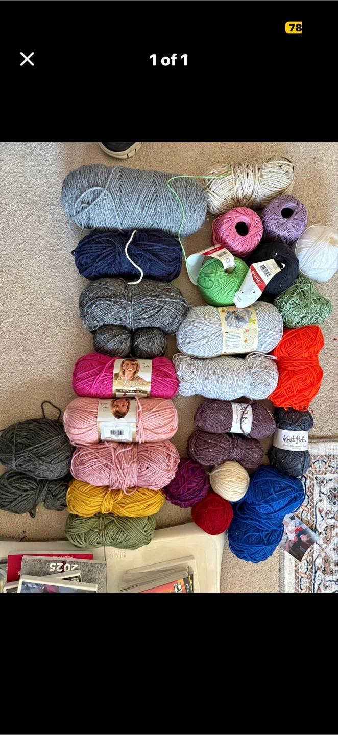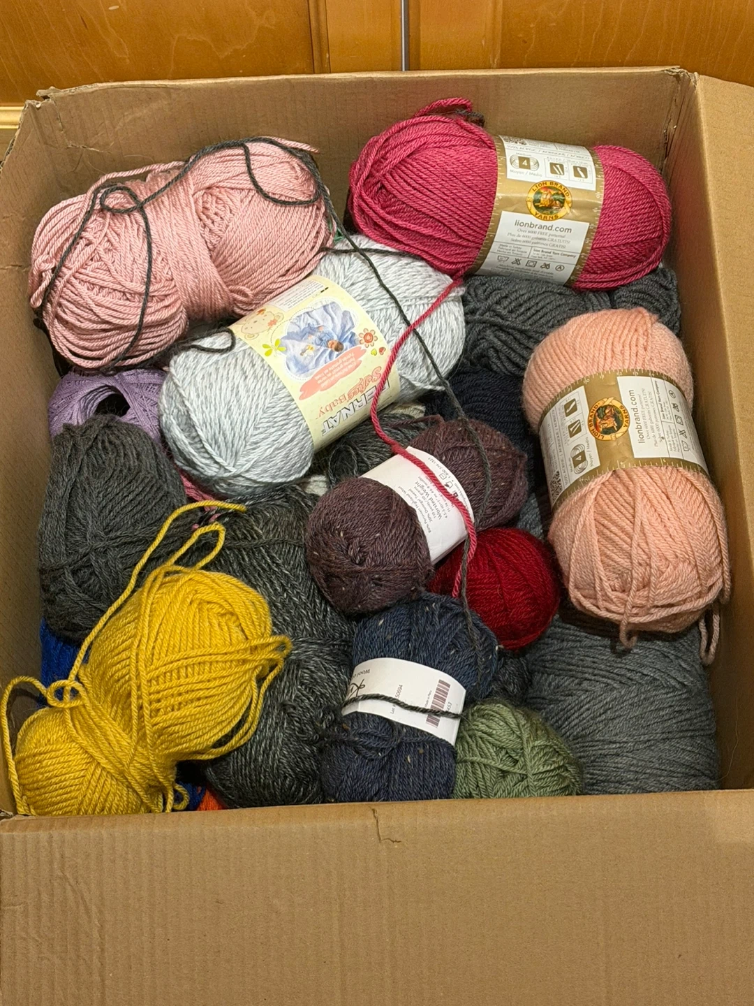 A collection of yarn skeins in a variety of colours, including blues, greys, pinks, and greens. Most skeins appear to be medium weight. Some brands visible include Lion Brand. Some are new some are used.