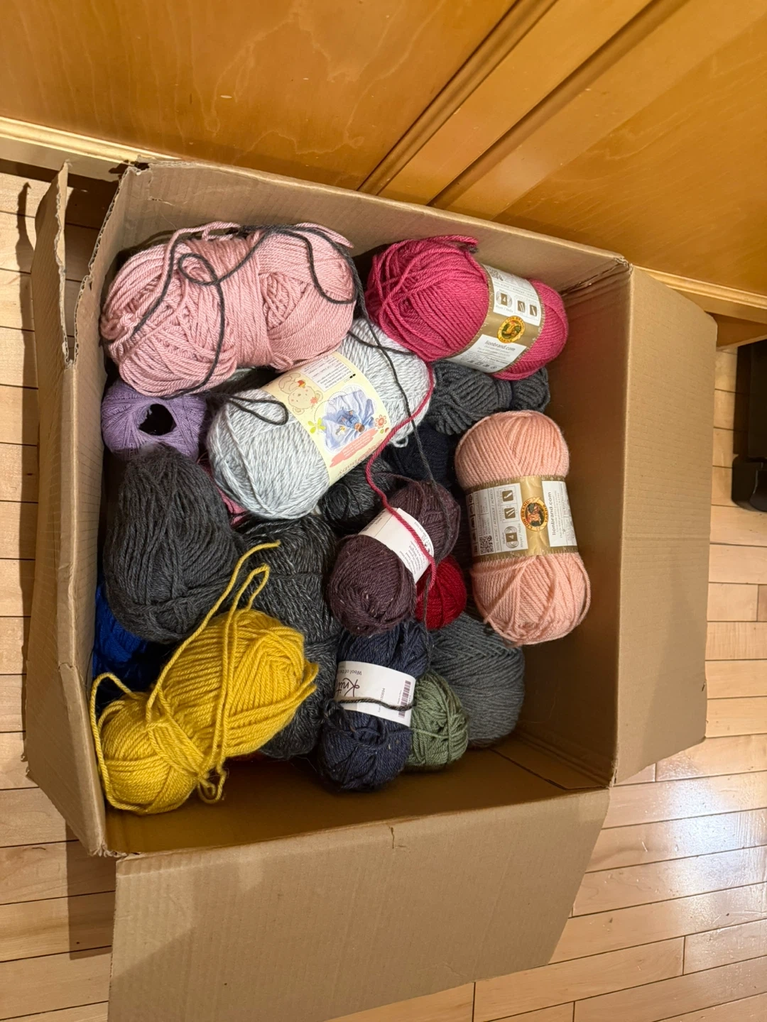 A collection of yarn skeins in a variety of colours, including blues, greys, pinks, and greens. Most skeins appear to be medium weight. Some brands visible include Lion Brand. Some are new some are used.