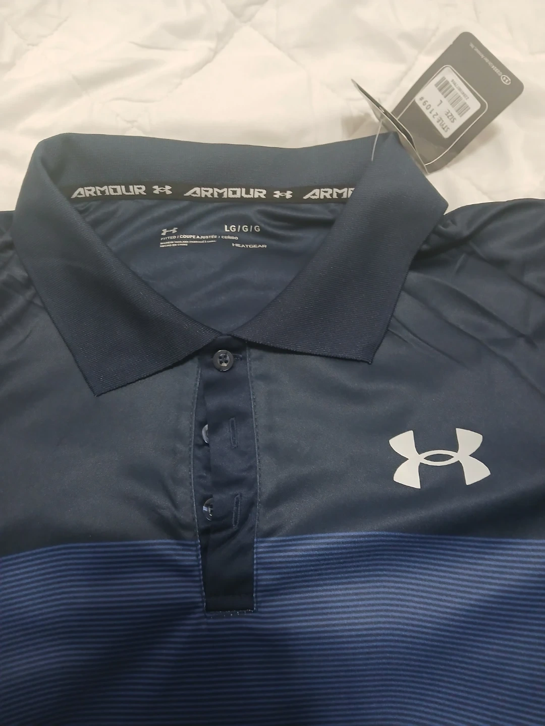 Under Armour polo shirt with HeatGear technology. It's navy blue with blue striped accents. Size is L. I bought the wrong size no stains no odors ,I'm selling for cheap price than in shop , it comes with the tags