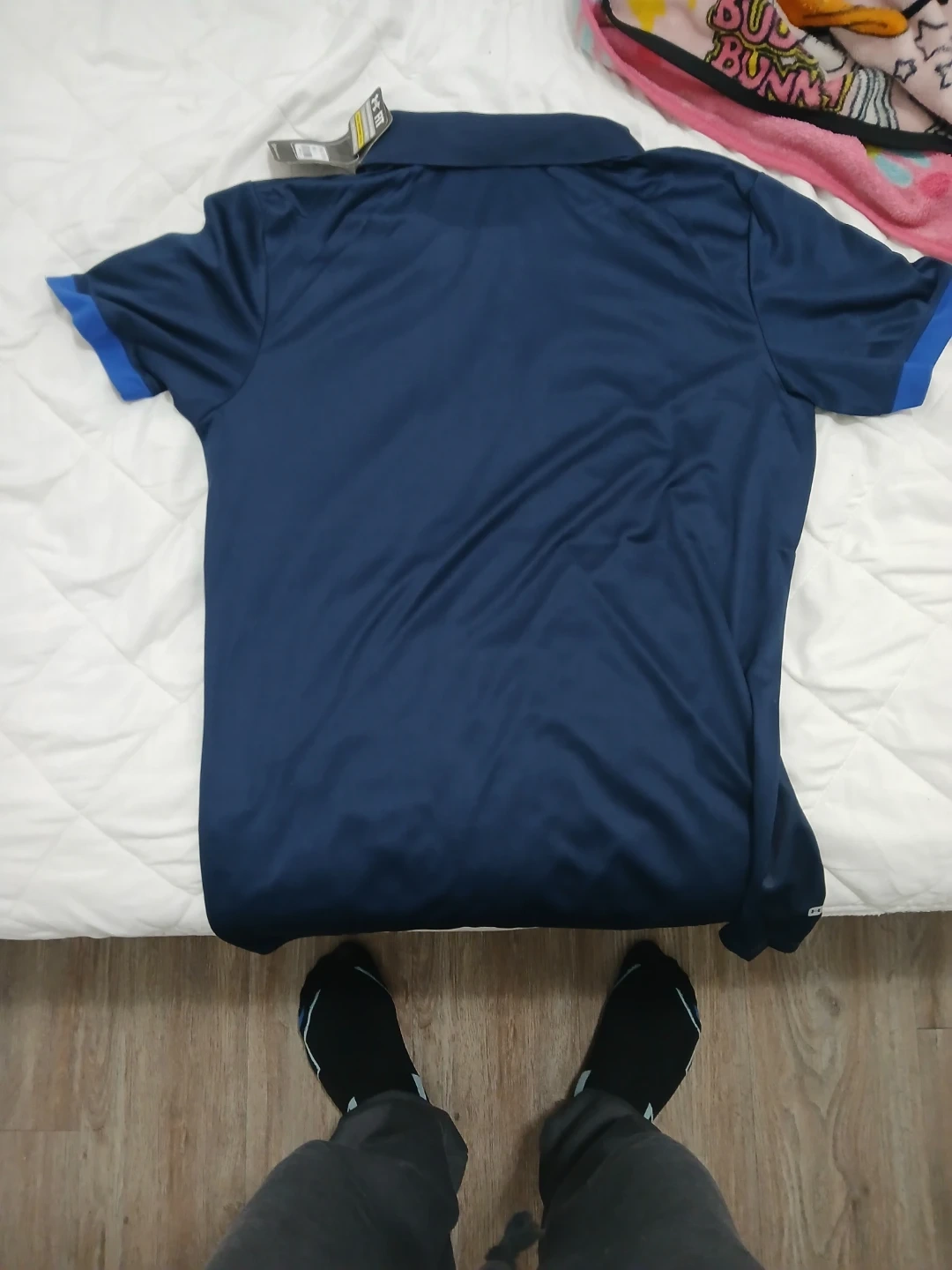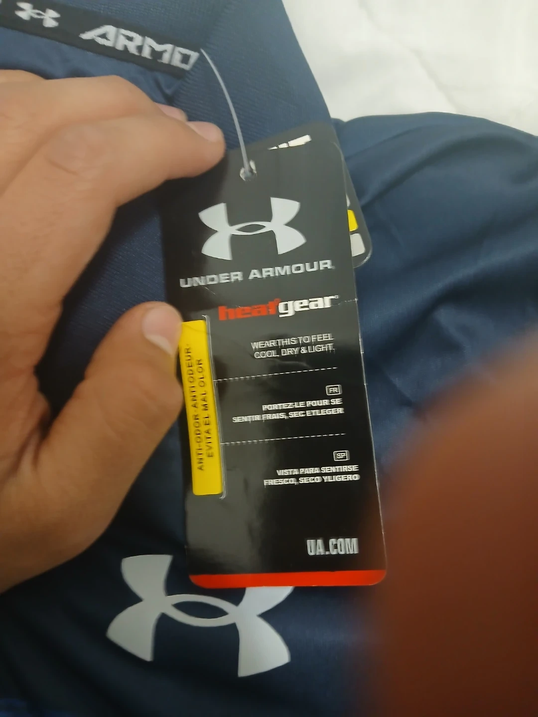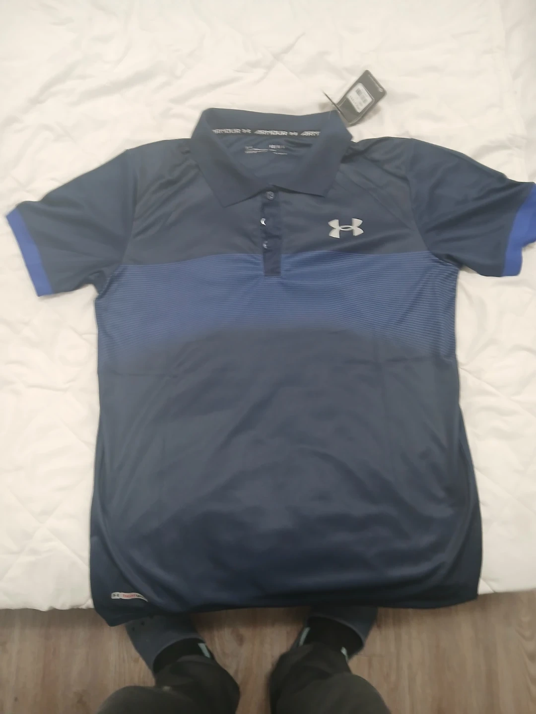 Under Armour polo shirt with HeatGear technology. It's navy blue with blue striped accents. Size is L. I bought the wrong size no stains no odors ,I'm selling for cheap price than in shop , it comes with the tags