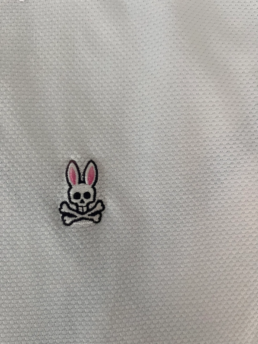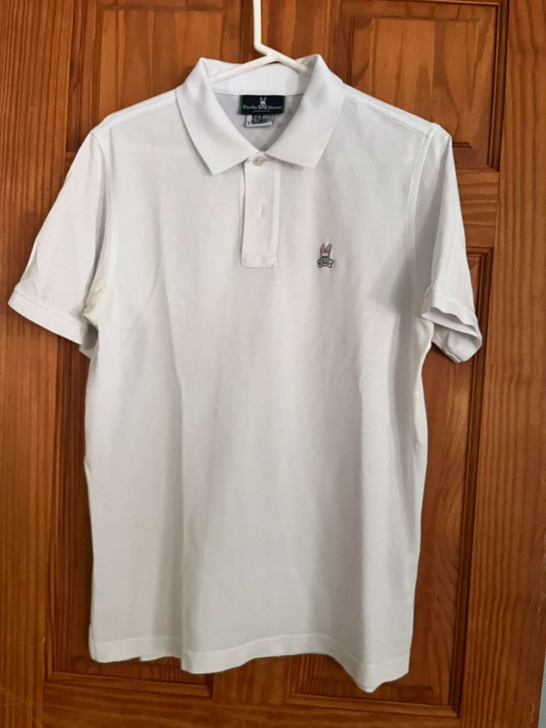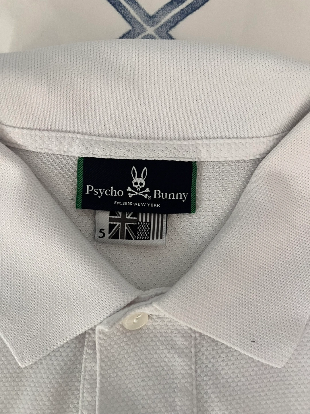 Selling a Psycho Bunny polo shirt in white. The size is a 5, which is equivalent to a large. It features the signature Psycho Bunny logo. Great for a casual or sporty look!