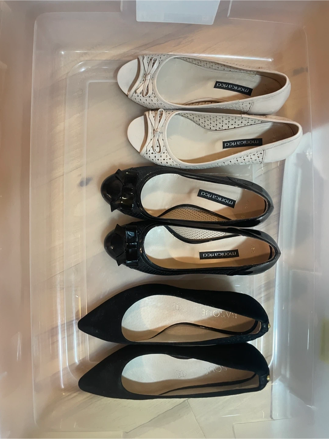 A collection of three pairs of women's flats. Two pairs are by Monica Ricci in cream with bow and laser-cut details. One pair is by Basqué in black suede with pointed toes. All are stylish and comfortable.