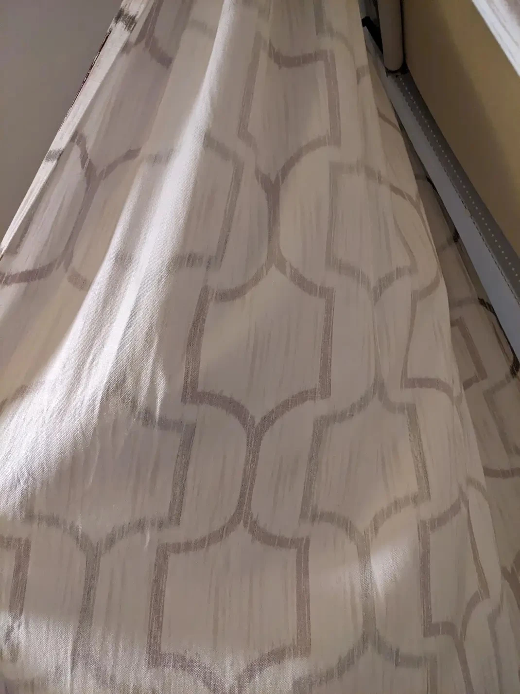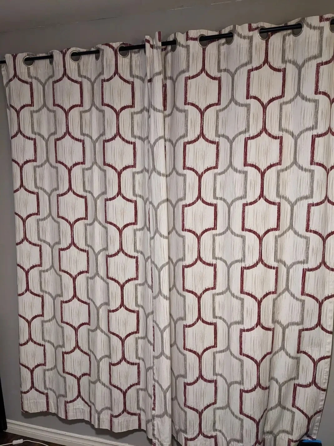 Two decorative window curtains with a geometric pattern, originally from Bed Bath & Beyond. They feature grommets for easy hanging. They're washed and in excellent shape.