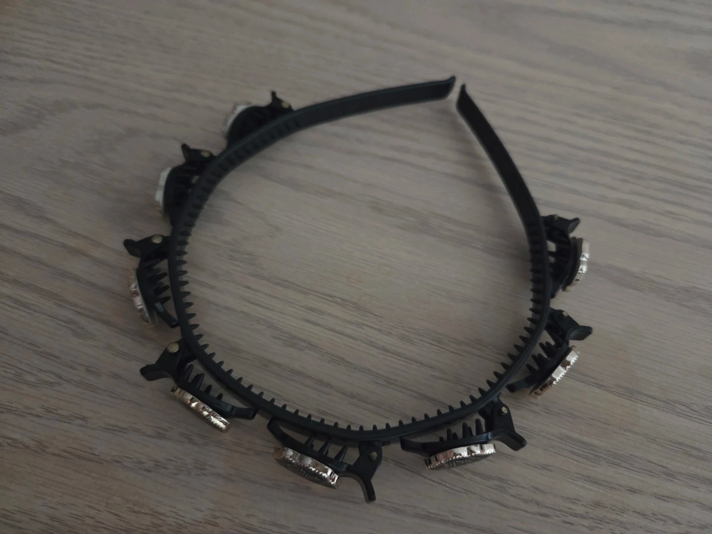 A stylish black headband adorned with sparkling rhinestones and decorative black roses. This hair accessory features small clips along the band for extra security. It's perfect for adding a touch of flair to your hairstyle for any occasion!