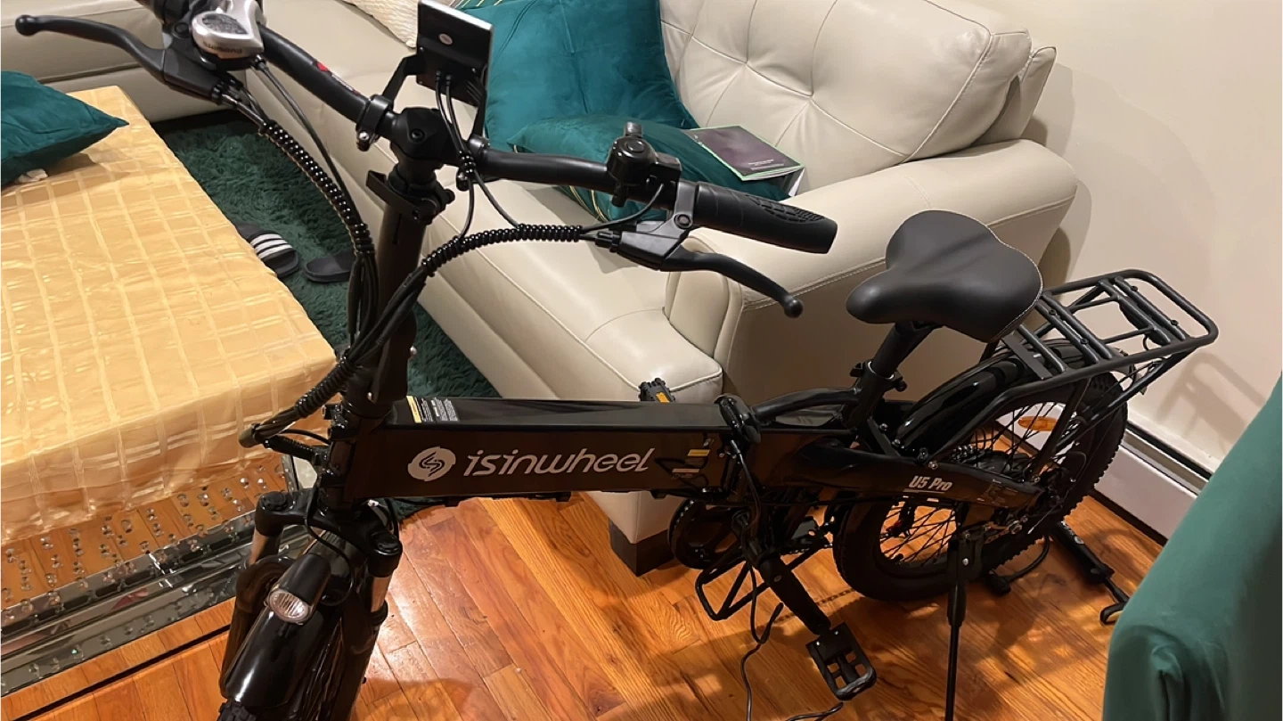 This is a black Sisinwheel US Pro electric folding bike. It features a foldable frame for easy storage and transport. The bike has a rear rack for carrying items. It's designed for convenient commuting and recreational rides.