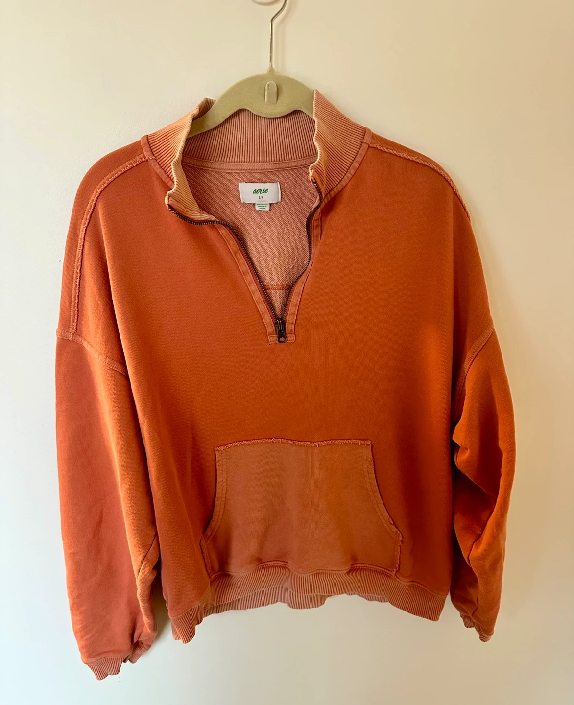 This Aerie pullover sweatshirt is a cozy orange color. It features a half-zip neckline and a front kangaroo pocket. Made from soft fleece material. S/P size.