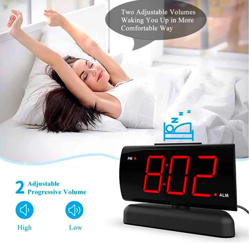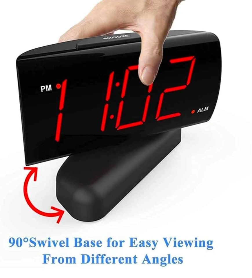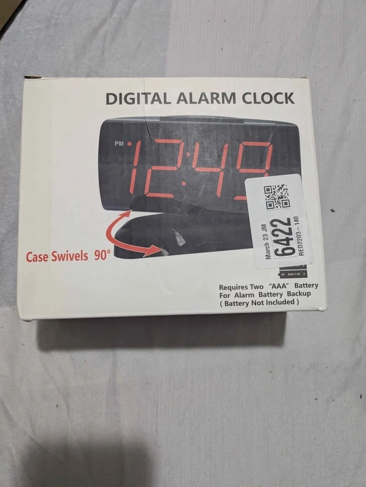 Selling this brand new alarm clock for $20. It features a 90° swivel base for perfect viewing angles, making it a nice decoration for any room like the living room, bedroom, kitchen, or nightstand. The 1.8'' large Red LED display has clear digits, easy to read day or night, even without glasses. It has a large snooze button on top for easy operation and a 9-minute snooze function, designed for heavy sleepers. The alarm volume has HI-LOW settings, and the display brightness is dimmable, helpful for those sensitive to light. It's easy to use, with buttons that have icons and words, making it friendly for elders. Powered by AC 120V electric power (standard US outlet). Includes AAA battery backup for power outages (battery not included).