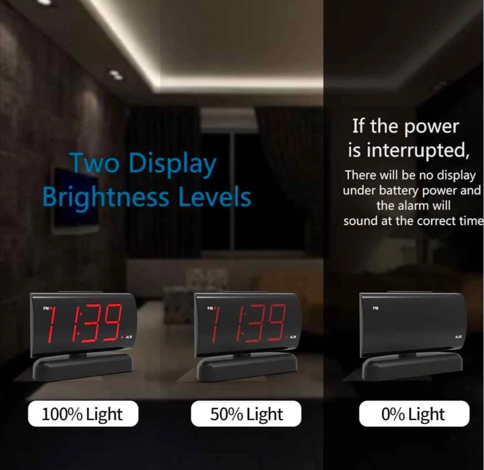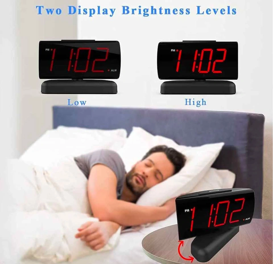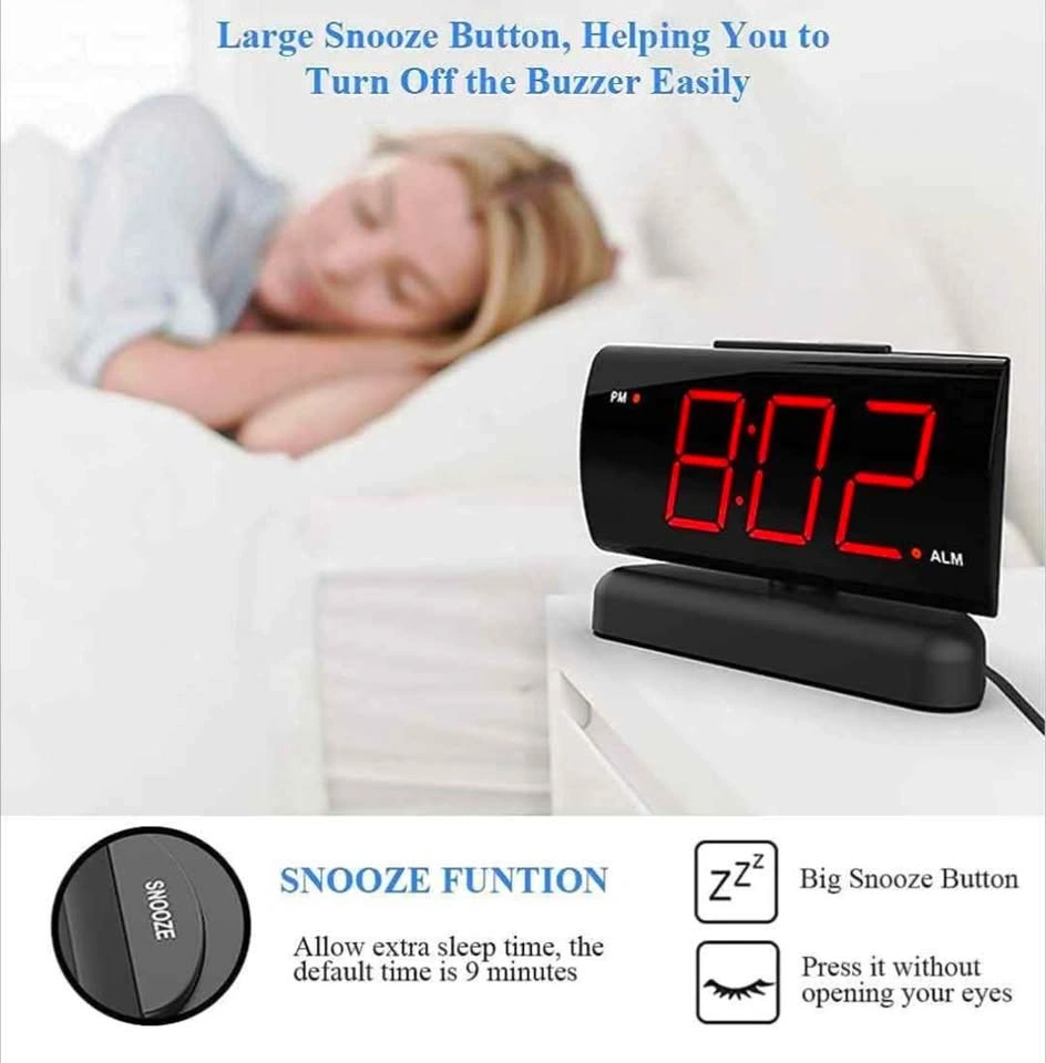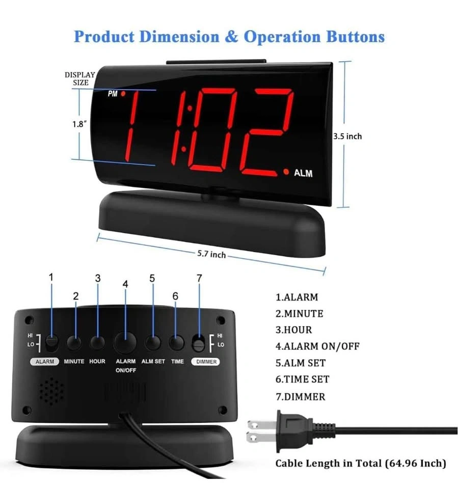 Selling this brand new alarm clock for $20. It features a 90° swivel base for perfect viewing angles, making it a nice decoration for any room like the living room, bedroom, kitchen, or nightstand. The 1.8'' large Red LED display has clear digits, easy to read day or night, even without glasses. It has a large snooze button on top for easy operation and a 9-minute snooze function, designed for heavy sleepers. The alarm volume has HI-LOW settings, and the display brightness is dimmable, helpful for those sensitive to light. It's easy to use, with buttons that have icons and words, making it friendly for elders. Powered by AC 120V electric power (standard US outlet). Includes AAA battery backup for power outages (battery not included).