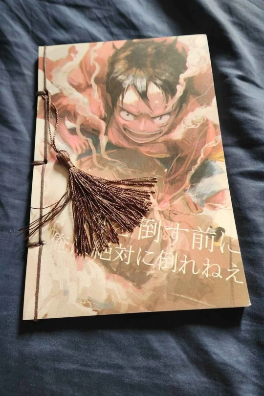 Unique One Piece themed journal. Features Luffy on the cover and other characters inside. Brown tassel bookmark. Blank lined pages. Perfect for fans.