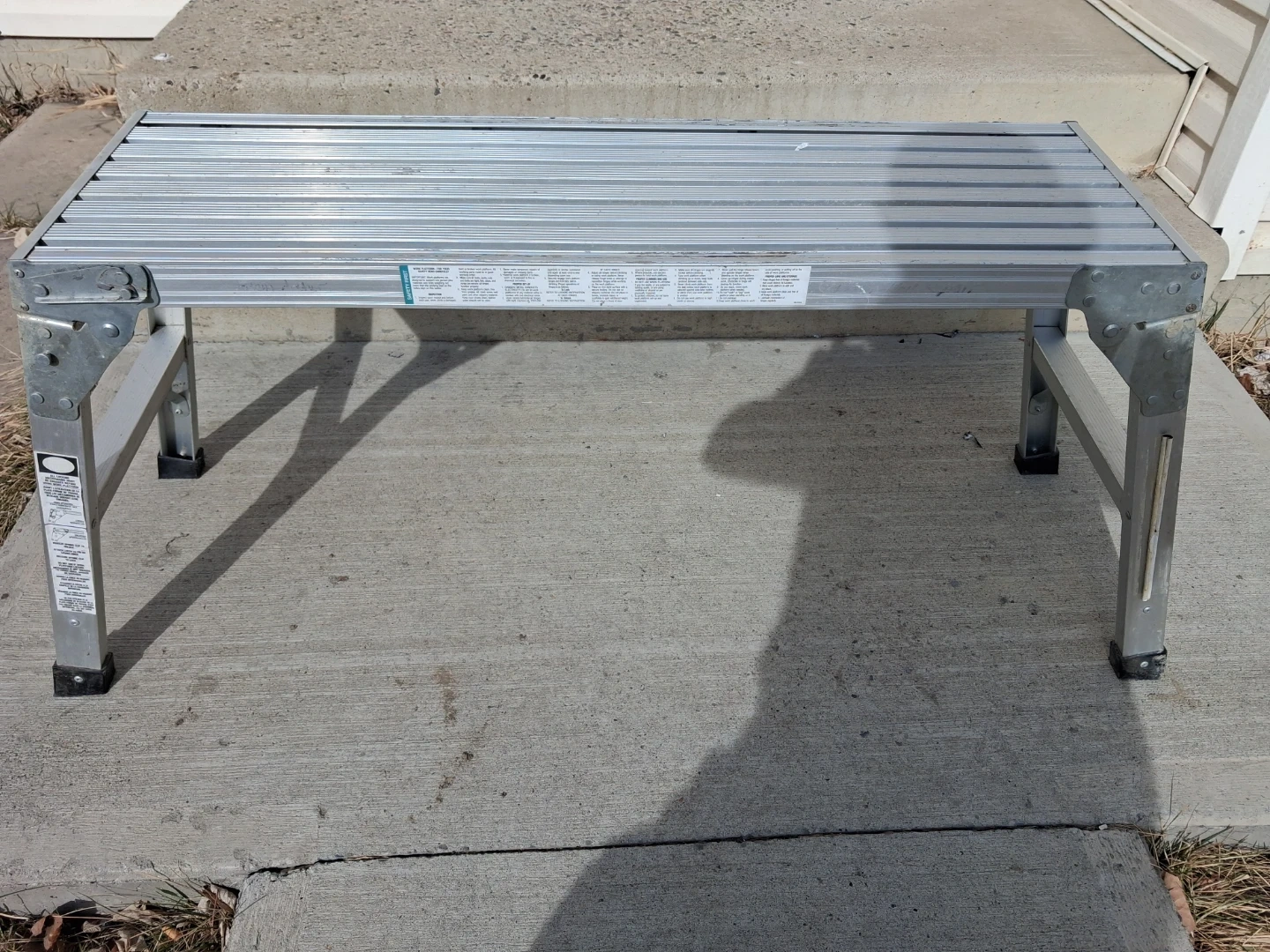 This is a new Termer aluminum step stool platform. It's made of durable aluminum and features a ribbed surface for traction. It's sturdy and has rubber feet for stability. This platform is useful for reaching higher shelves or for use as a small workbench.