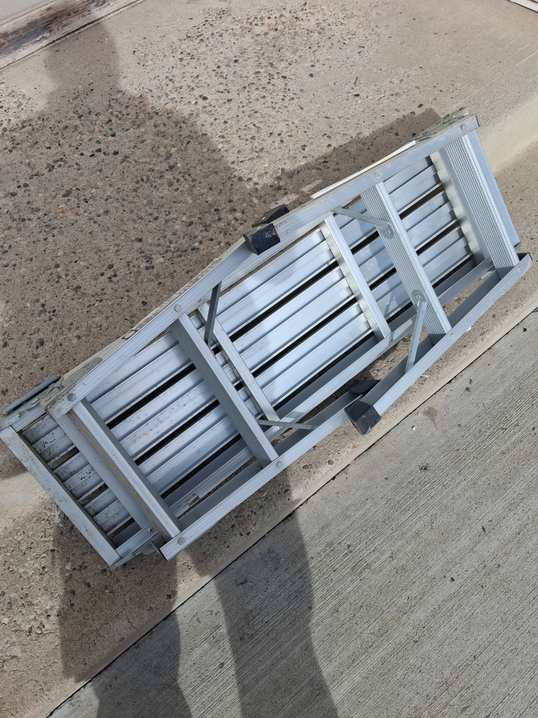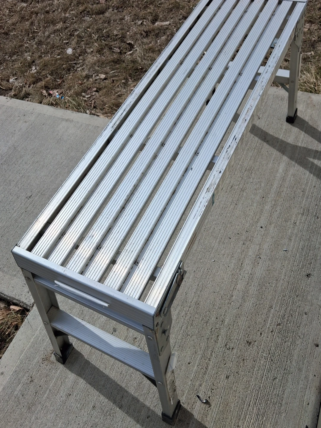 This is a new Termer aluminum step stool platform. It's made of durable aluminum and features a ribbed surface for traction. It's sturdy and has rubber feet for stability. This platform is useful for reaching higher shelves or for use as a small workbench.