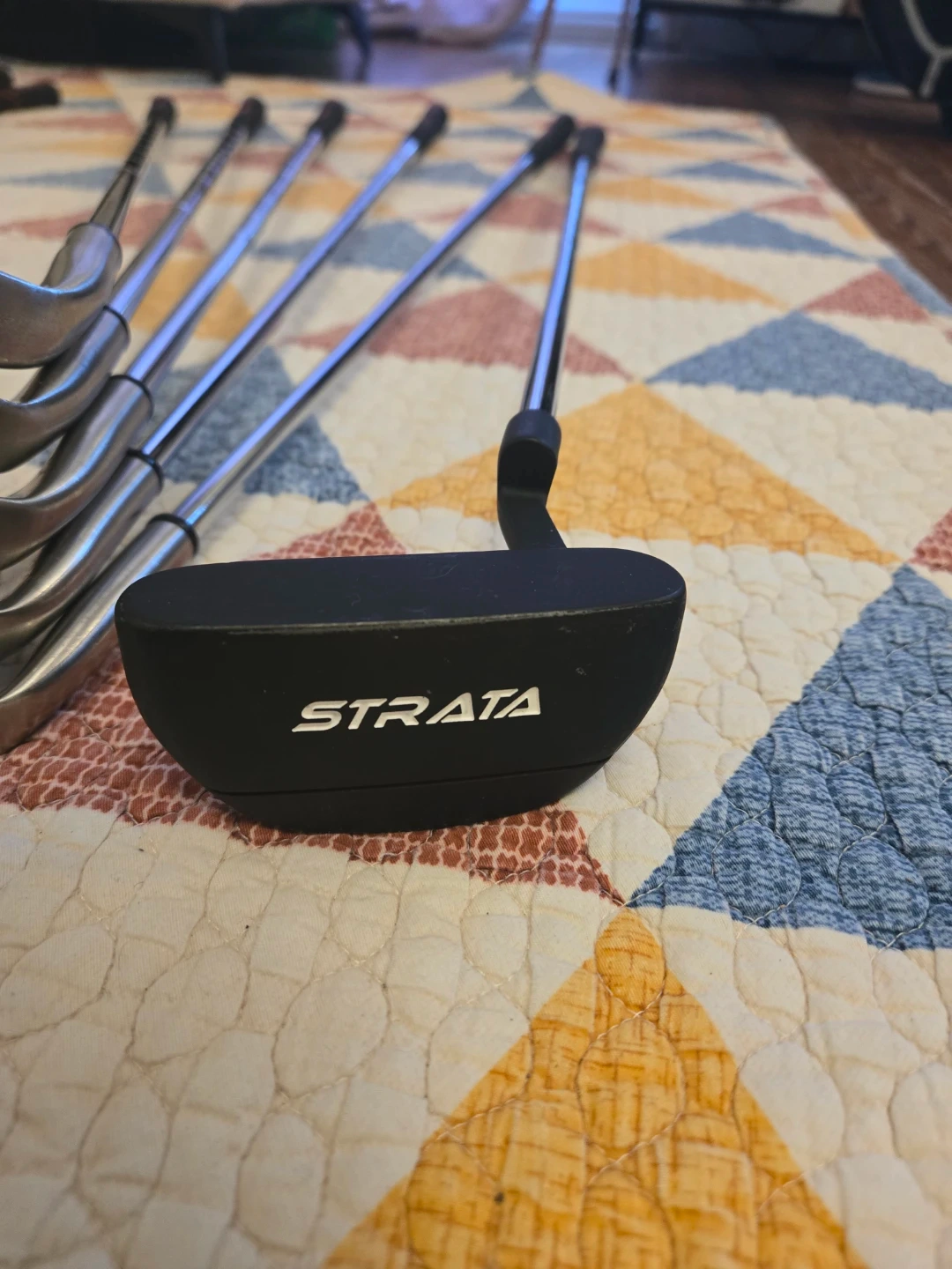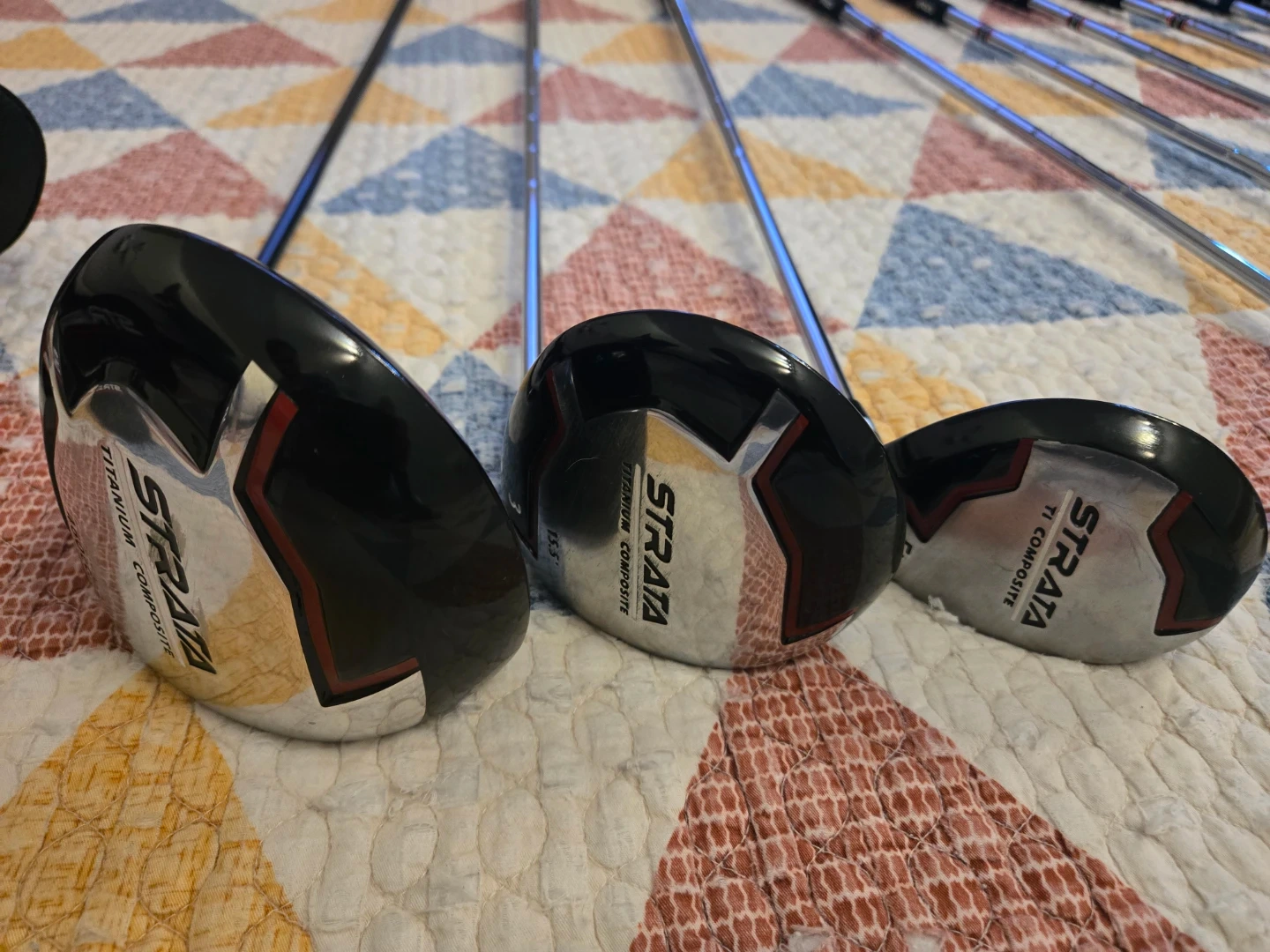 Full set of Strata golf clubs including a stand bag. Includes driver, fairway woods, hybrids, irons (6-PW), and a putter. Some club heads have "Titanium Composite" branding.