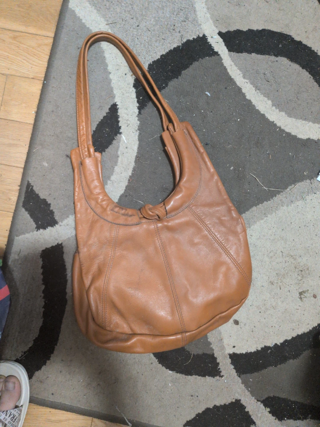 A stylish brown leather shoulder bag, perfect for everyday use! It's a great size for carrying your essentials and has a comfortable shoulder strap. The leather is in good condition and has a lovely, soft feel to it