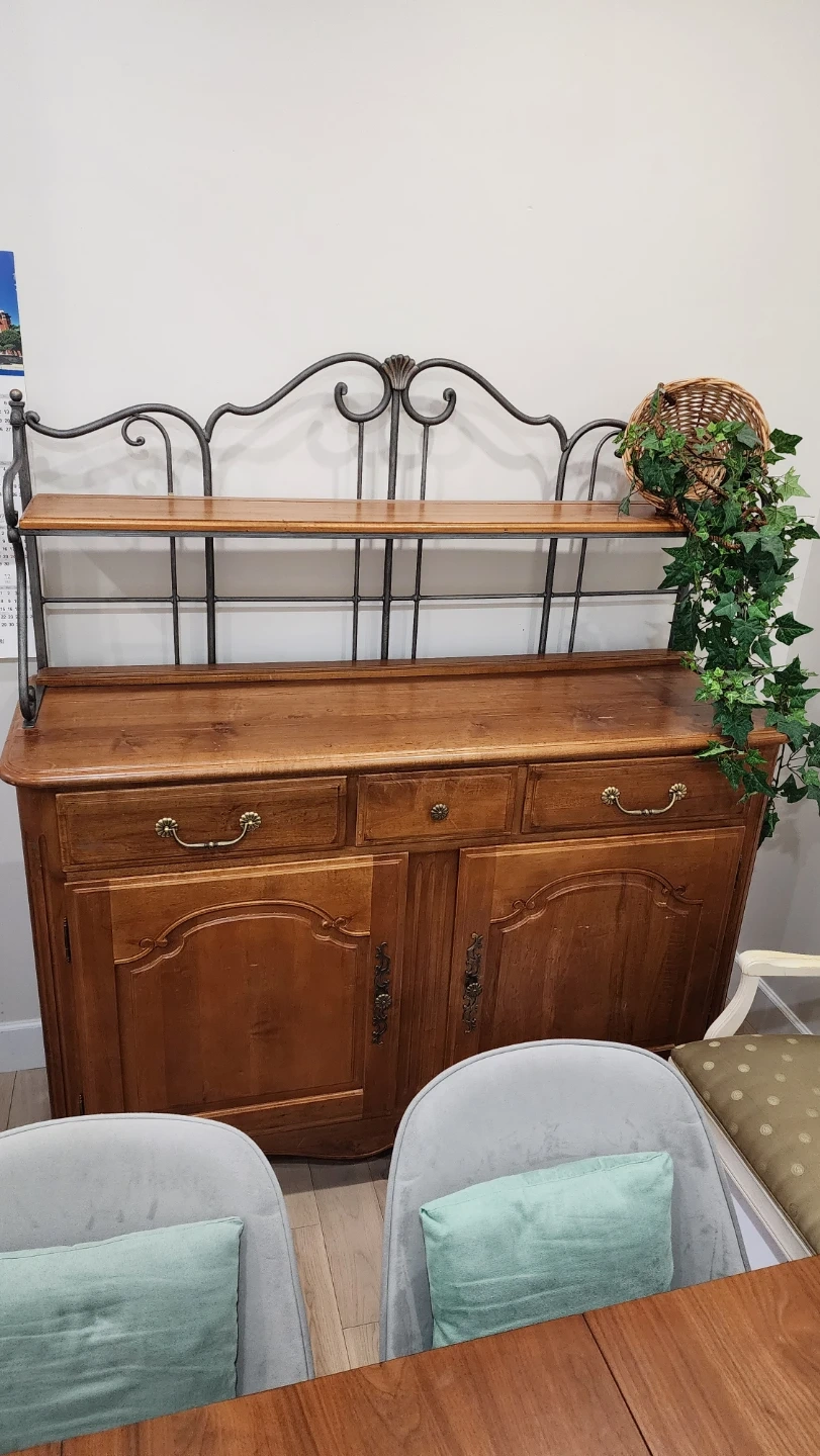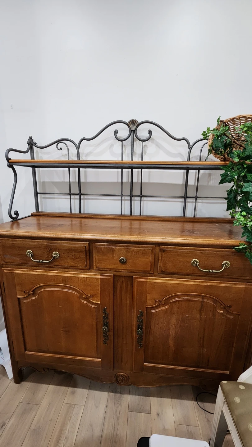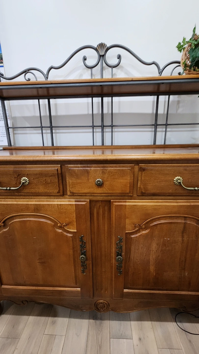 A beautiful wooden sideboard buffet with a decorative metal hutch. It features three drawers and two cabinet doors for storage. This piece would make a lovely addition to a dining room or kitchen.