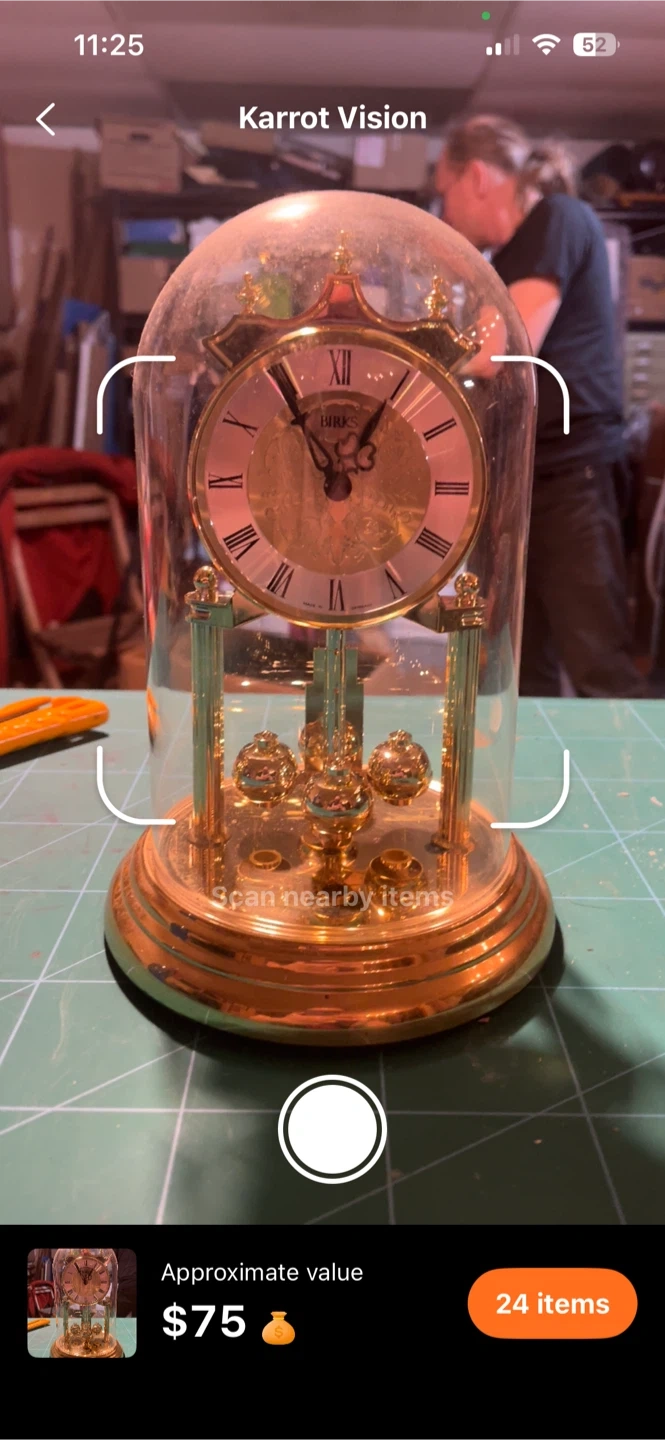 A decorative āfake brassā skeleton clock enclosed in a glass dome. The dome is glass but the clock is chrome plated plastic. It is so convincing that the Karrot value estimate guessed it to be brass.