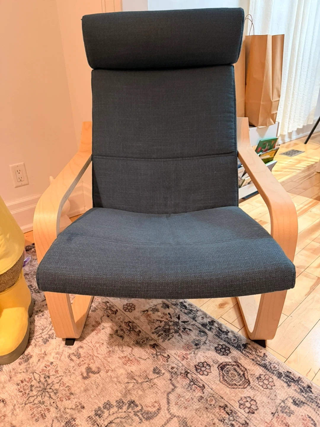 This is an IKEA Poäng chair upholstered in a dark blue fabric. It features a bentwood frame for a comfortable, flexible seat. The chair's design offers good lumbar support. A great spot for relaxing in any room!