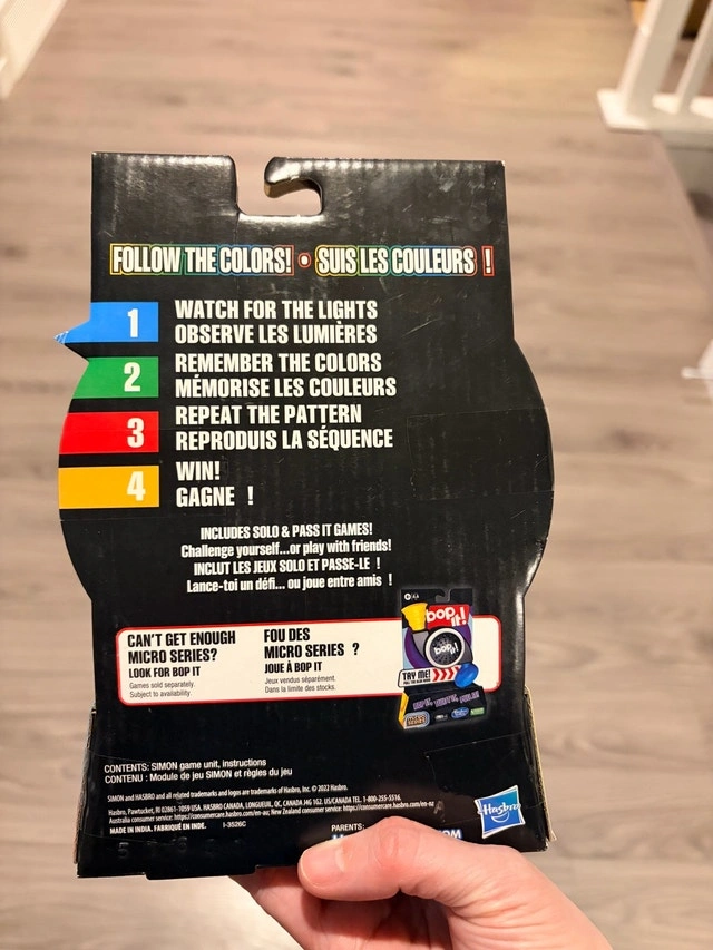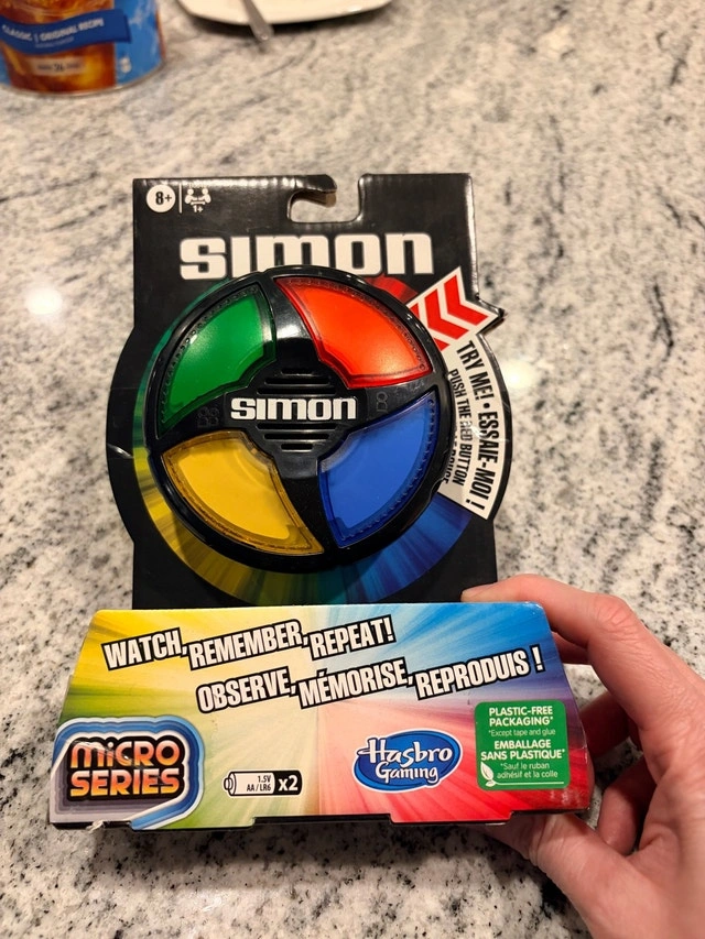 Great for a birthday gift! Test your memory skills with this classic Simon Micro Series game! This compact, handheld version of the original Simon game is perfect for on-the-go fun. The game is new in its original packaging, ready to challenge players of all ages. Watch, remember, and repeat the sequence of lights and sounds to win!