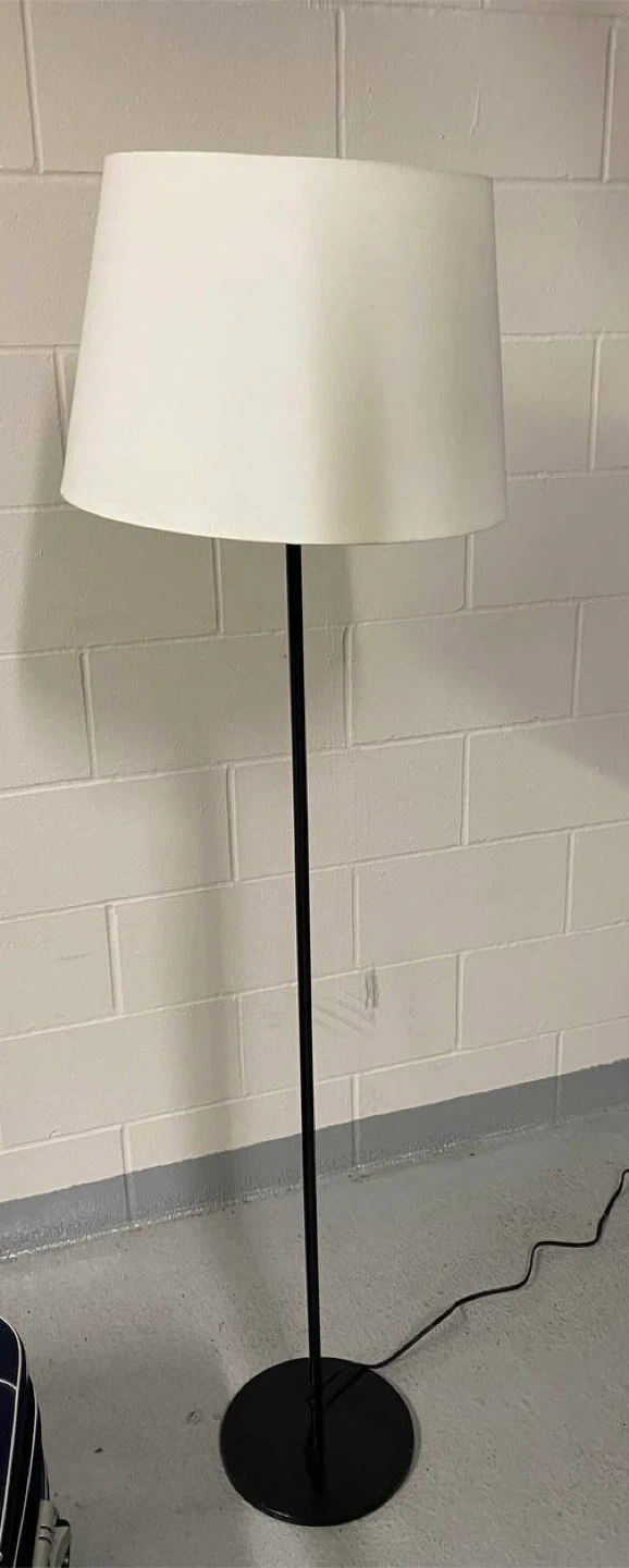 This floor lamp features a large white drum shade and a slim black pole with a round base. It's a classic design that'll fit in most rooms. The lamp uses one bulb and has a cord for power.