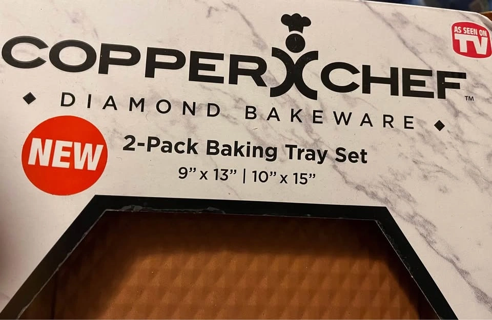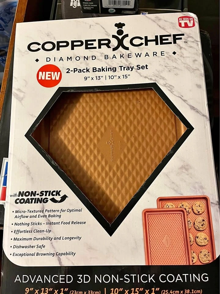 New inbox Copper Chef diamond bakeware two-pack baking tray set. Includes 9" x 13" and 10" x 15" cookie sheets. Nonstick coating. Pick up in Lockport. Cash only.