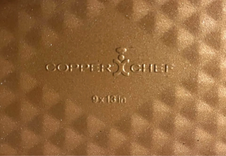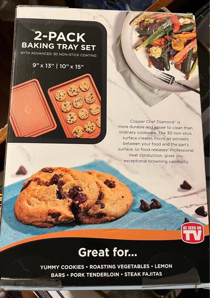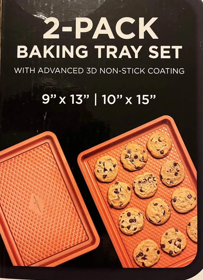 New inbox Copper Chef diamond bakeware two-pack baking tray set. Includes 9" x 13" and 10" x 15" cookie sheets. Nonstick coating. Pick up in Lockport. Cash only.