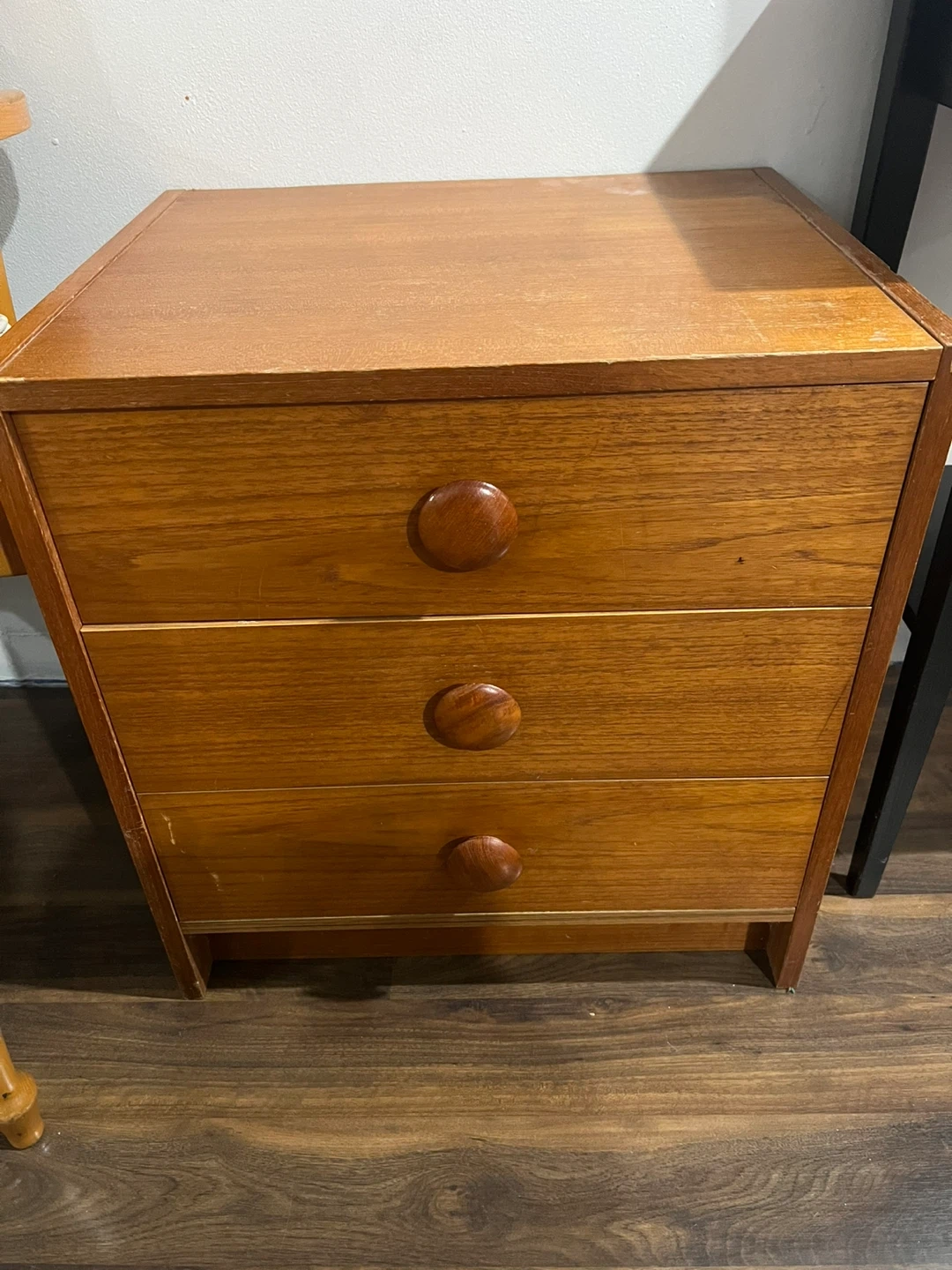 Here's a simple wood dresser with three drawers! It's perfect for adding some storage to any room. It has a warm, natural wood finish and round drawer pulls. It's in good condition and ready for a new home