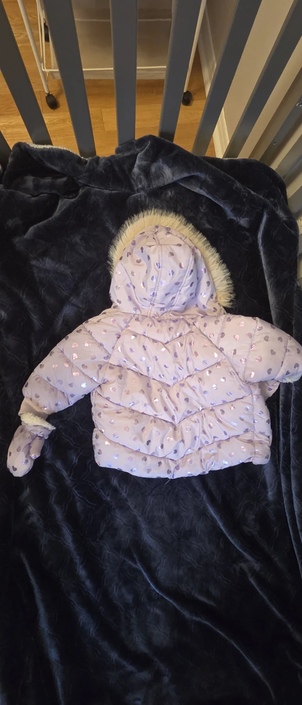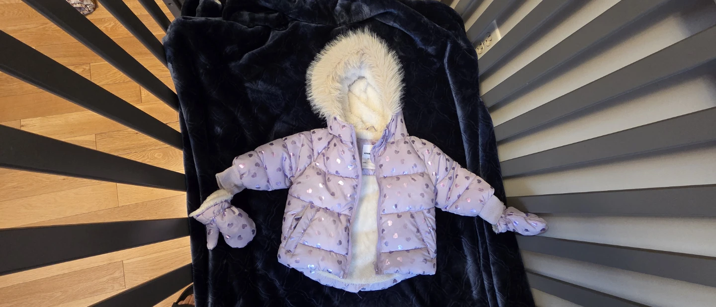 Selling a Sinsay Baby puffer jacket in size 68cm. It's a light purple colour with heart print and a soft, furry lining. Comes with matching mittens!