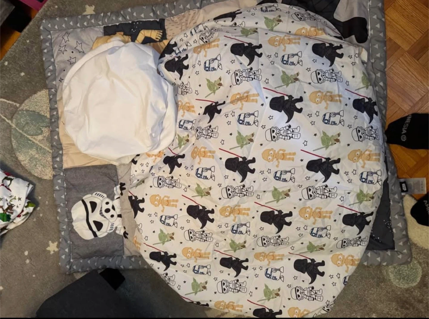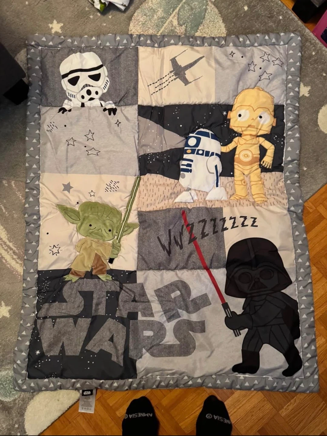 Adorable Star Wars themed baby quilt. Features Darth Vader, Stormtrooper, Yoda, R2-D2, and C-3PO. It's made from soft fabric, perfect for tummy time or a crib.