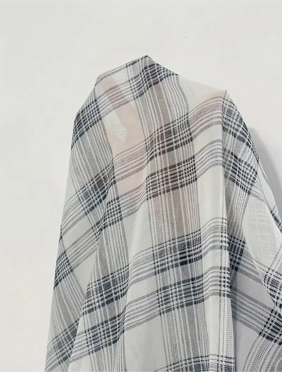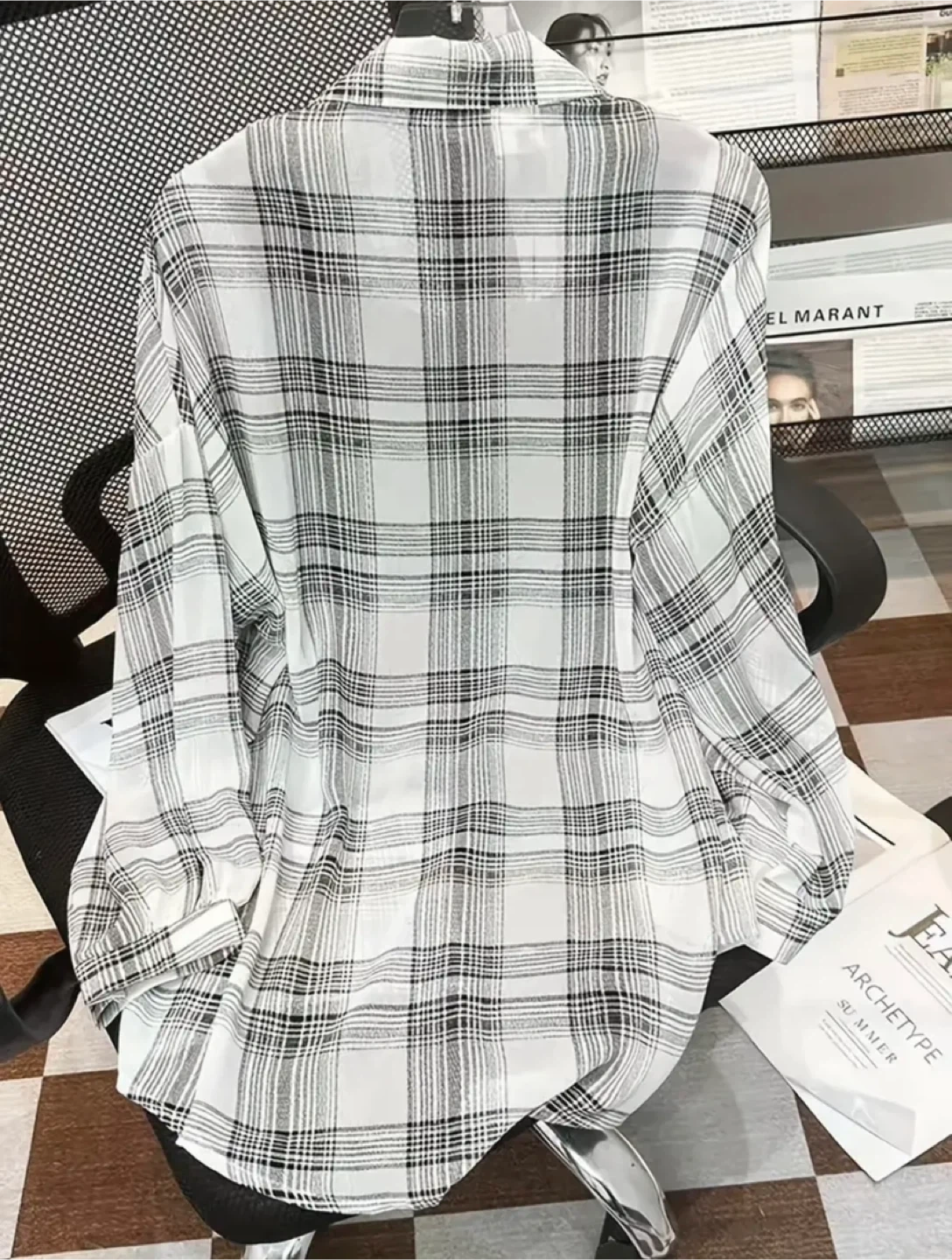 Here's a white long-sleeved shirt with a black plaid pattern. It's a lightweight and stylish piece, perfect for layering or wearing on its own. The material is soft and comfortable, making it great for everyday wear