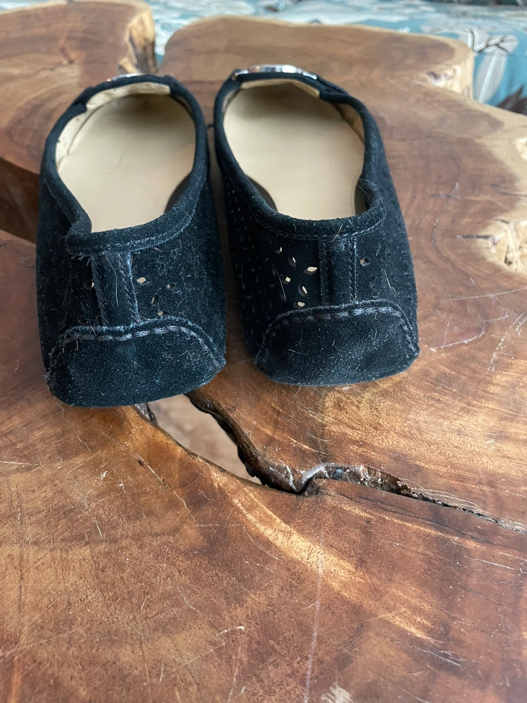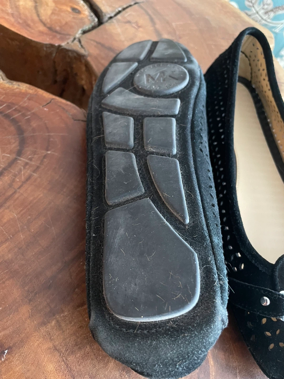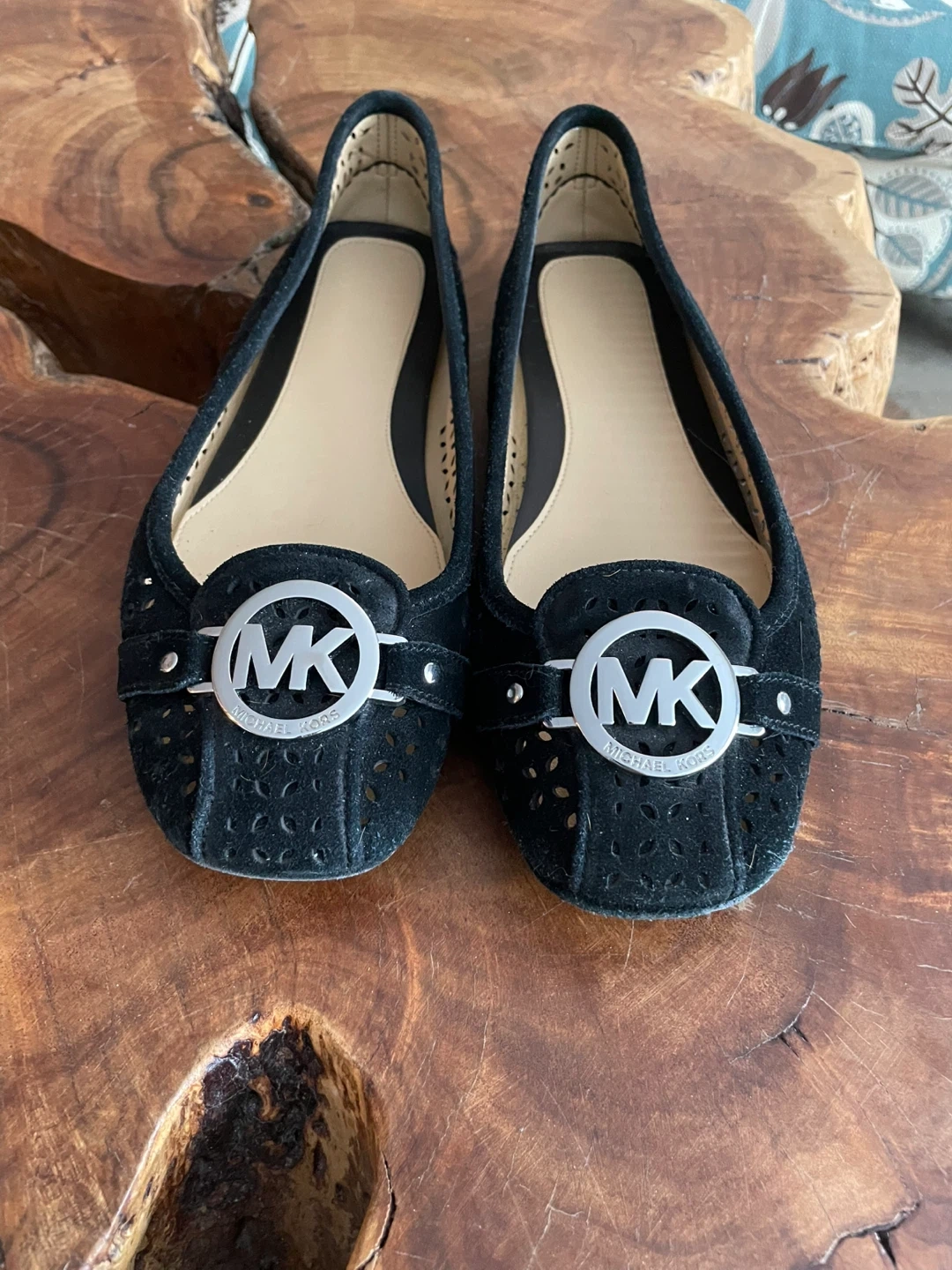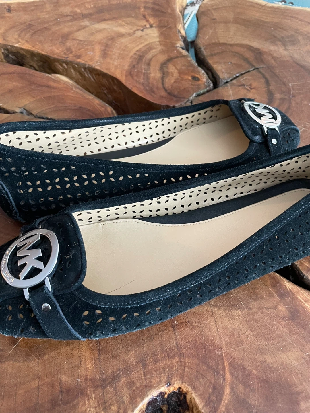 Michael Kors ballet flats in black suede. They feature decorative perforations and a light gold MK logo detail. Authentic purchases at Browns Shoes . These comfortable shoes have never been worn outside. And only worn a few times . They are a pinch large for me.