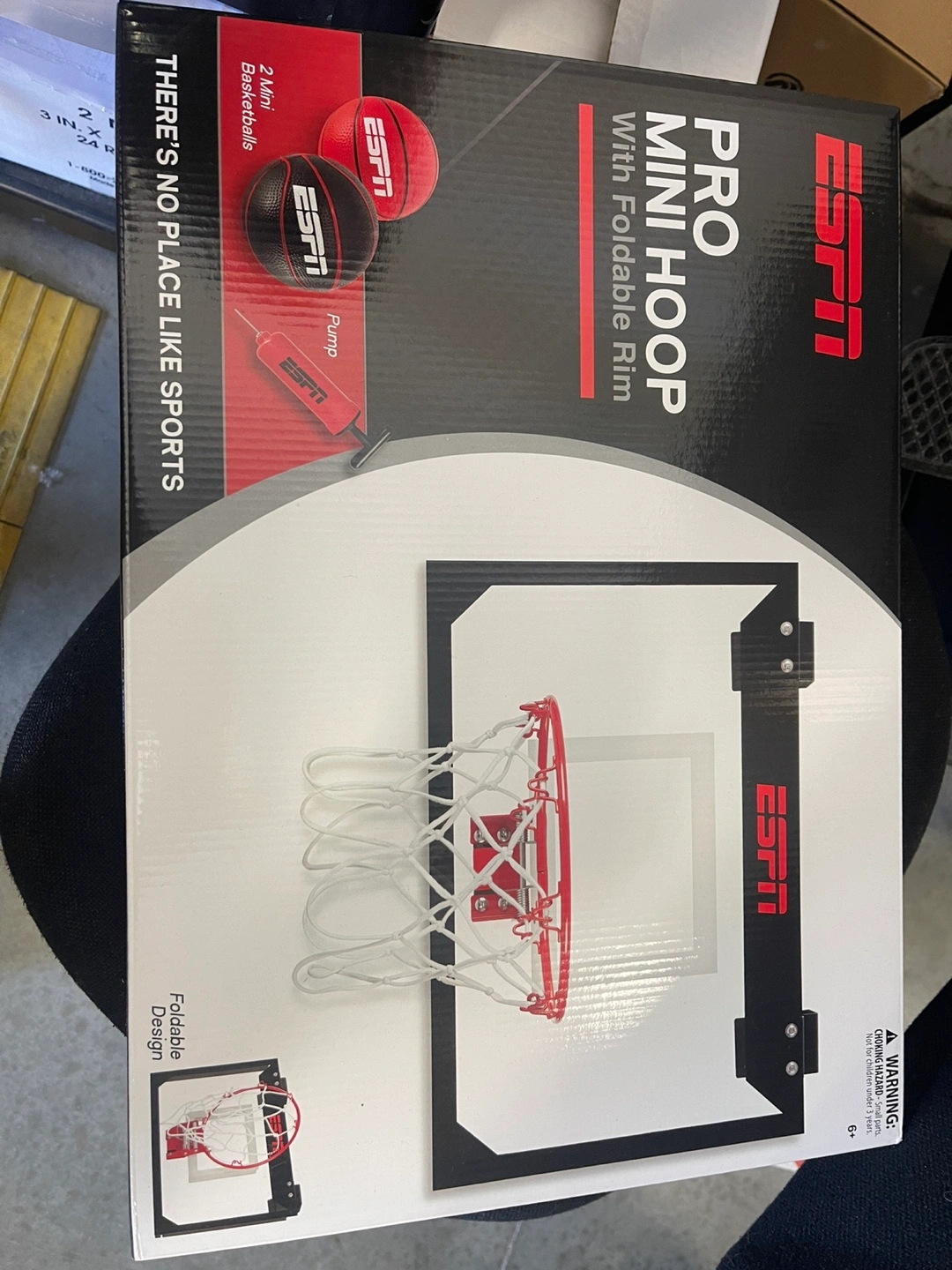 Mini Basketball hoop set. Includes a foldable rim, 2 mini basketballs, and pump. Dimension are 18x12” - clear, shatterproof backboard - steel breakaway rim - foam-padded door mounts Thanks for looking