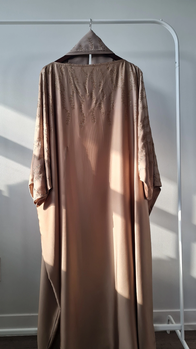 Flowy golden kaftan. Features delicate gold gemstone work along the top and sleeves. Loose fit. Elegant design that's perfect for parties and special occasions.