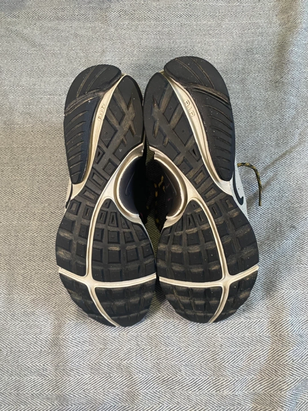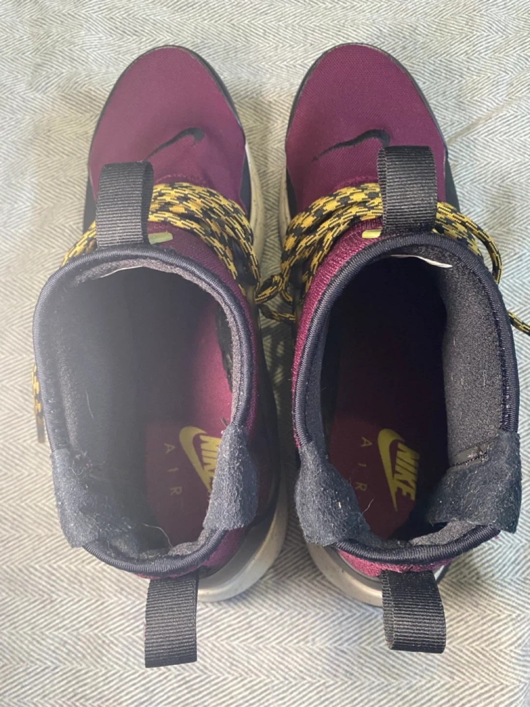 Selling a pair of Nike Air Presto Mid Utility shoes in size 10 US. They feature a unique burgundy and black colourway with speckled white accents. The laces are a cool yellow and black pattern. The soles show some signs of wear, but overall they're still in good condition!