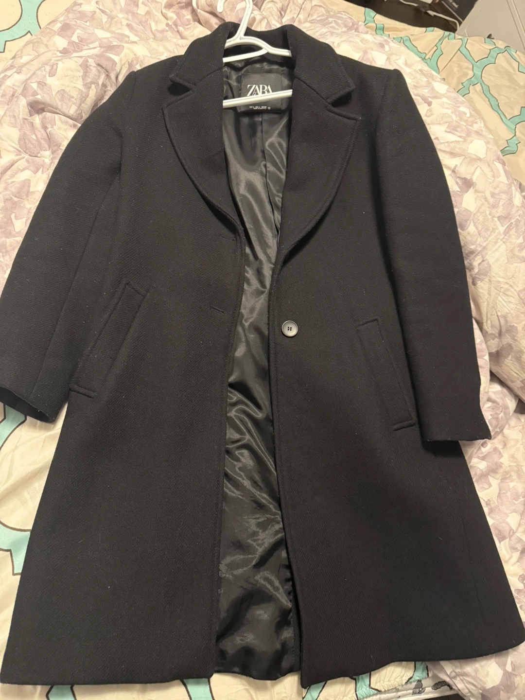 This Zara coat is a classic black colour and made from a wool blend fabric. It's a size Large with a satin lining. Features a single button closure and two front pockets.