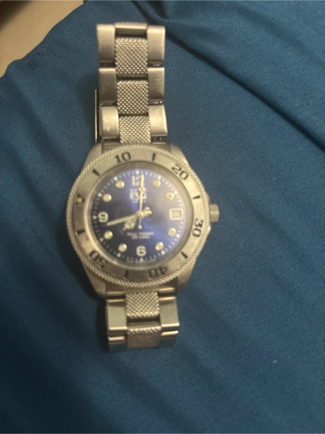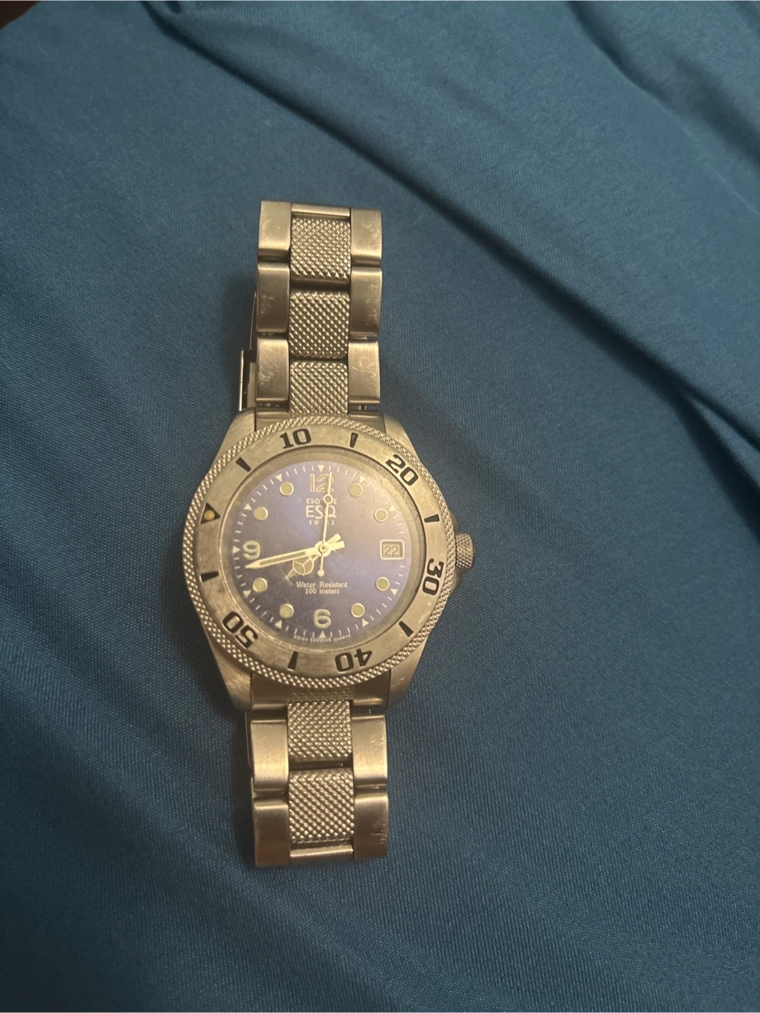 Selling a Swiss Made ESQ watch. It's a stylish timepiece with a stainless steel band and a blue face. Water resistant up to 100 meters. A few scratches are visible on the watch face.