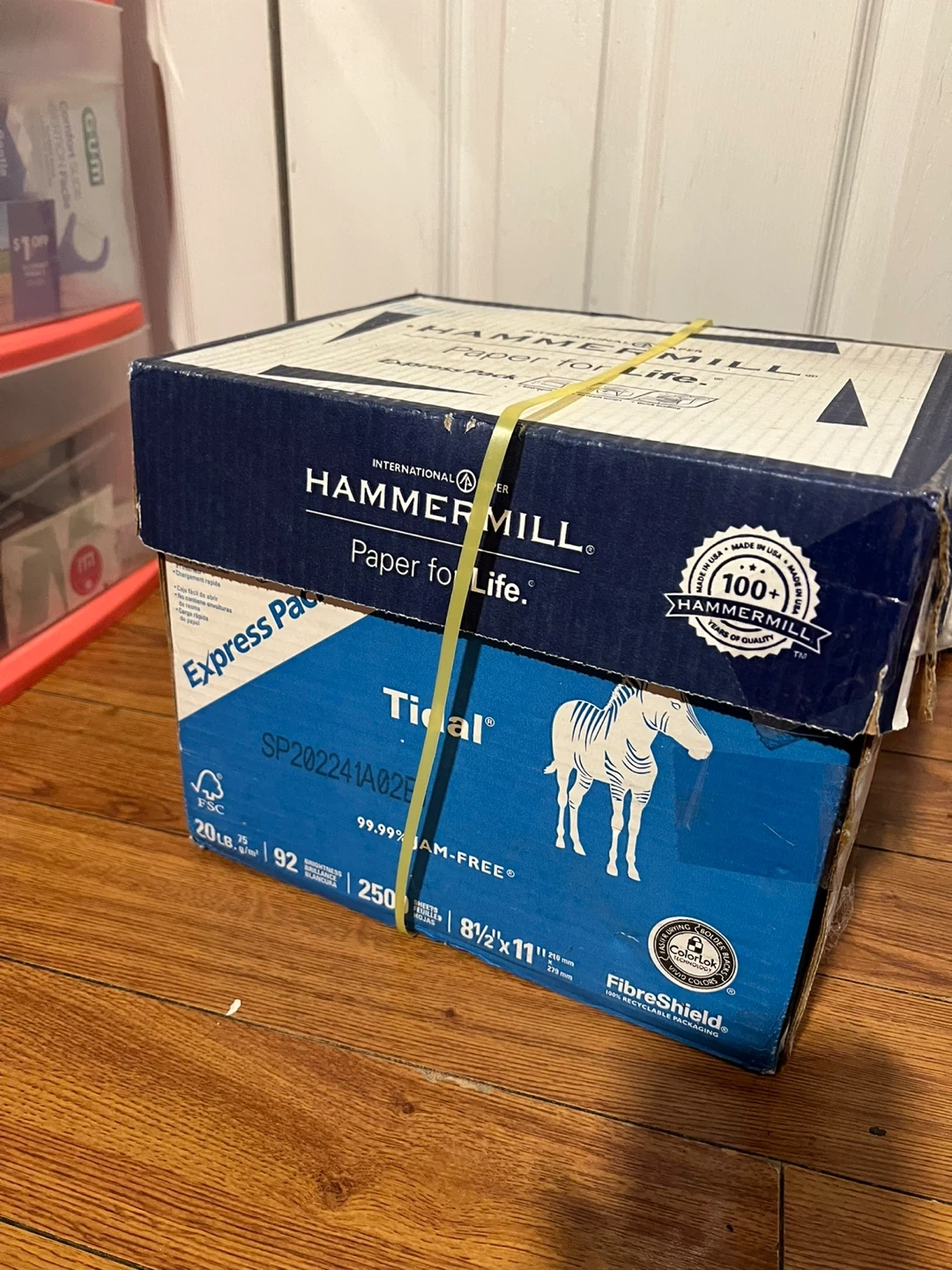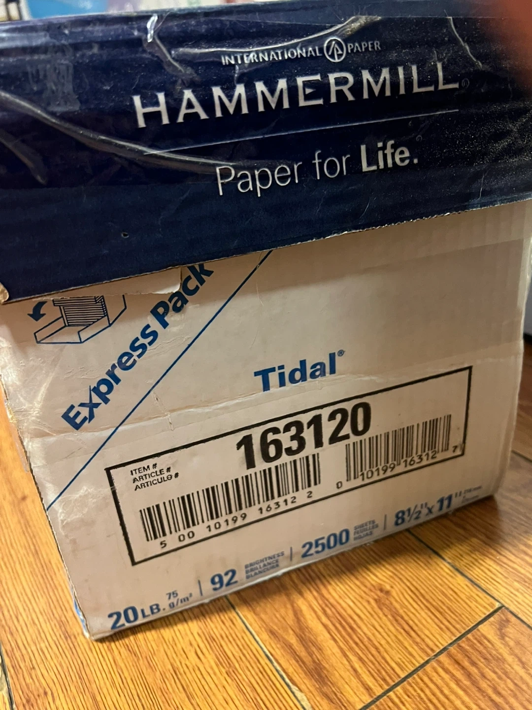 Hammermill Tidal printer paper. It's 20lb weight and 92 brightness. This pack includes 2500 sheets of 8.5" x 11" paper. It's acid-free, making it suitable for archival use.