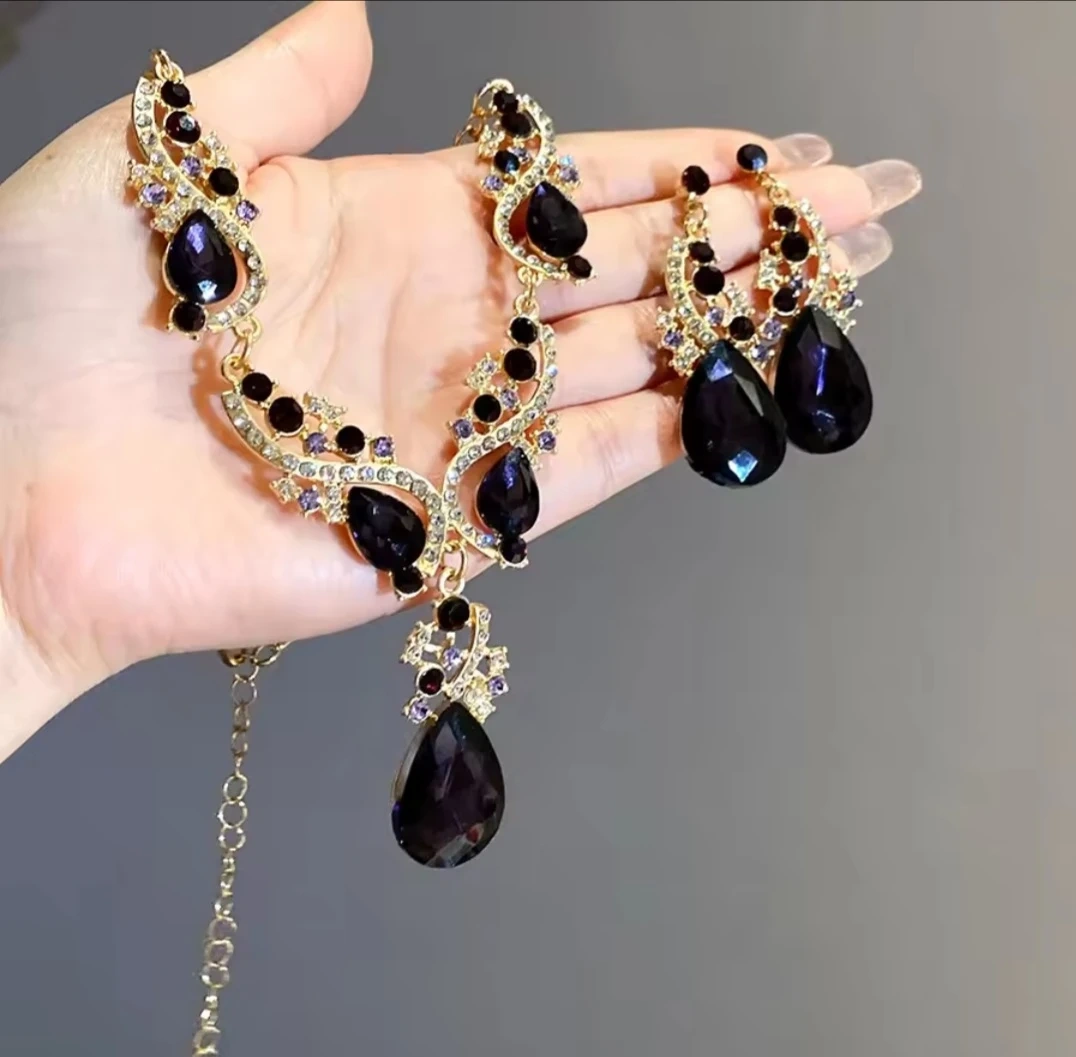A matching necklace and dangle earrings set. It's gold-tone with clear and purple accent stones, featuring large, dark teardrop-shaped pendants. This set adds a touch of glamour to any outfit!