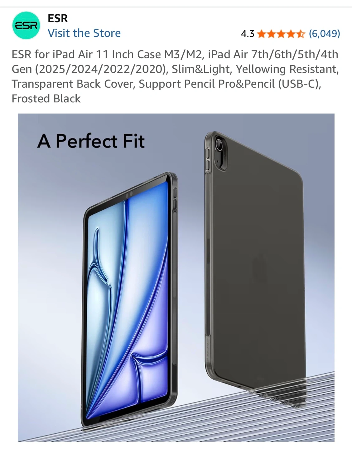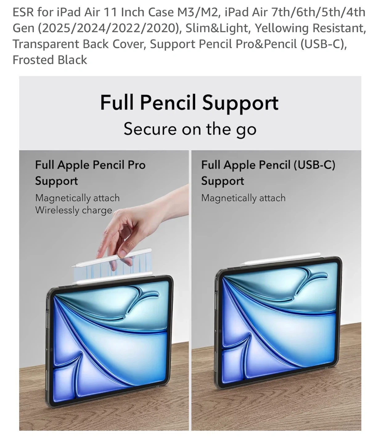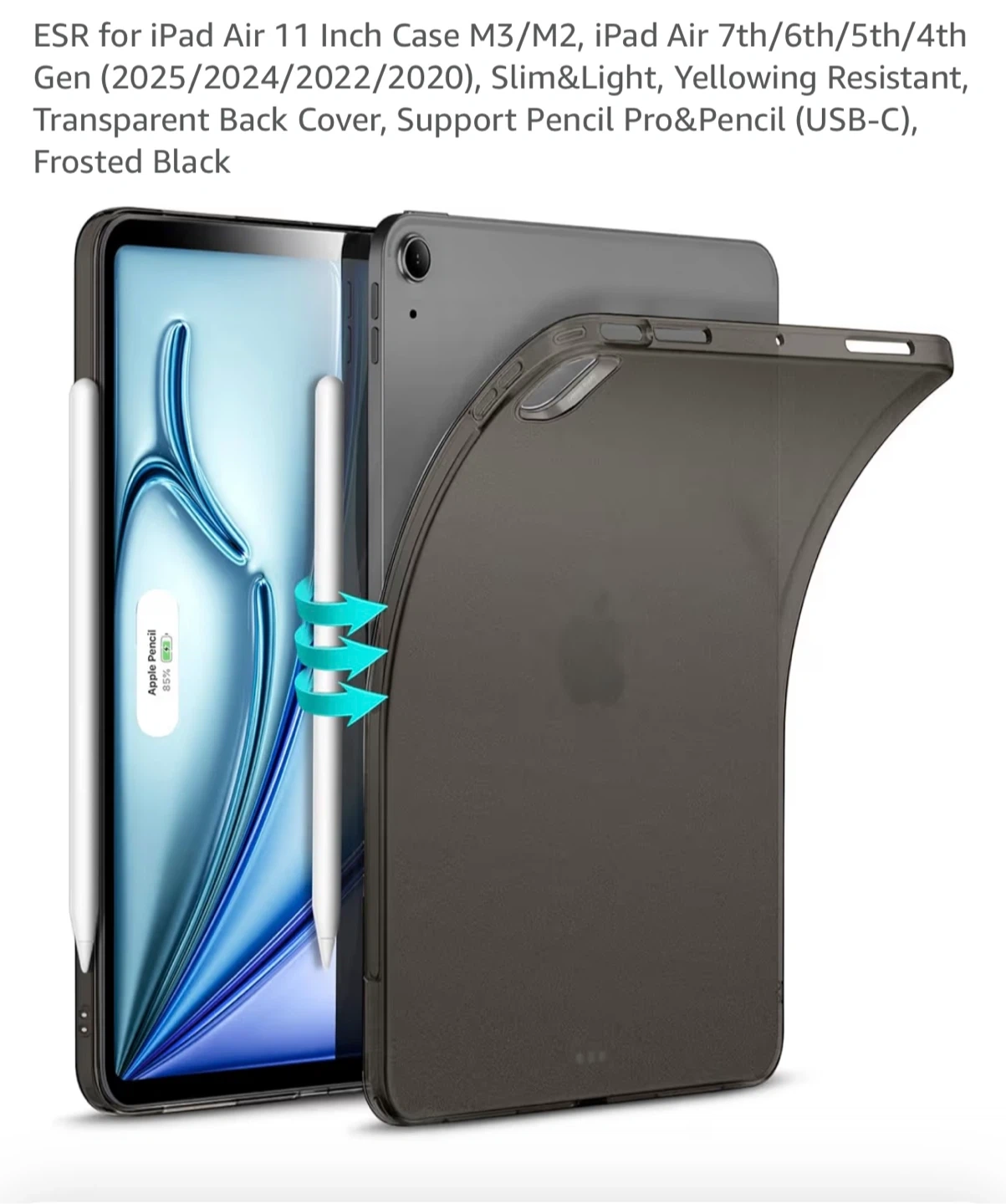 53This ESR case is designed for the iPad Air 11 inch, compatible with M3/M2, and iPad 7th/6th/5th/4th Gen models. It's a slim and light case, with yellowing-resistant material and a transparent back cover. It also supports the Pencil Pro and Pencil (USB-C) for convenient use!