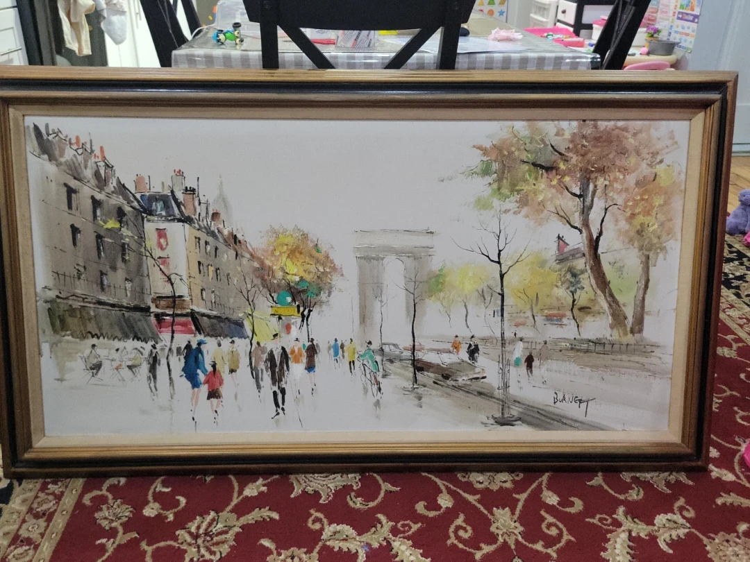 Vintage oil painting depicting a Parisian street scene with the Arc de Triomphe. Features a rich palette of autumn colors and lively figures. Framed and ready for display. Signed 'Burney' on the bottom right.