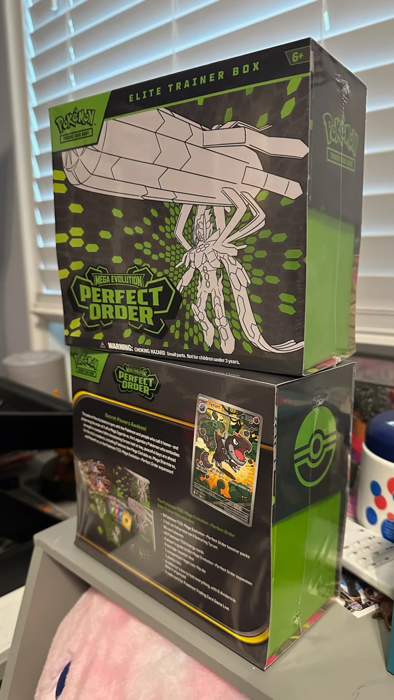 This Pokemon TCG Elite Trainer Box features the Mega Evolution-Perfect Order expansion. It includes booster packs, a promo card, energy cards, and card sleeves. It's a great way to store your collection!