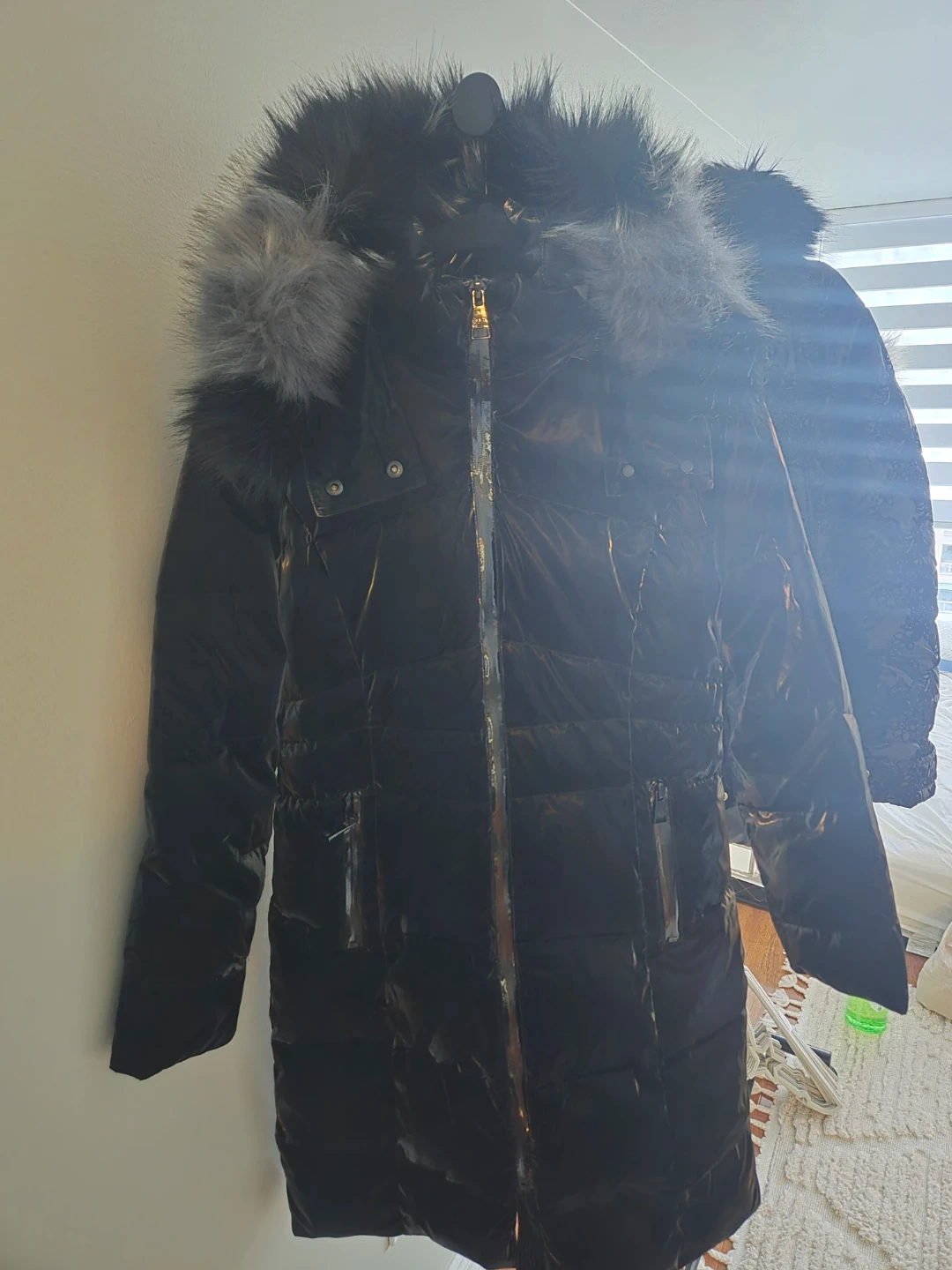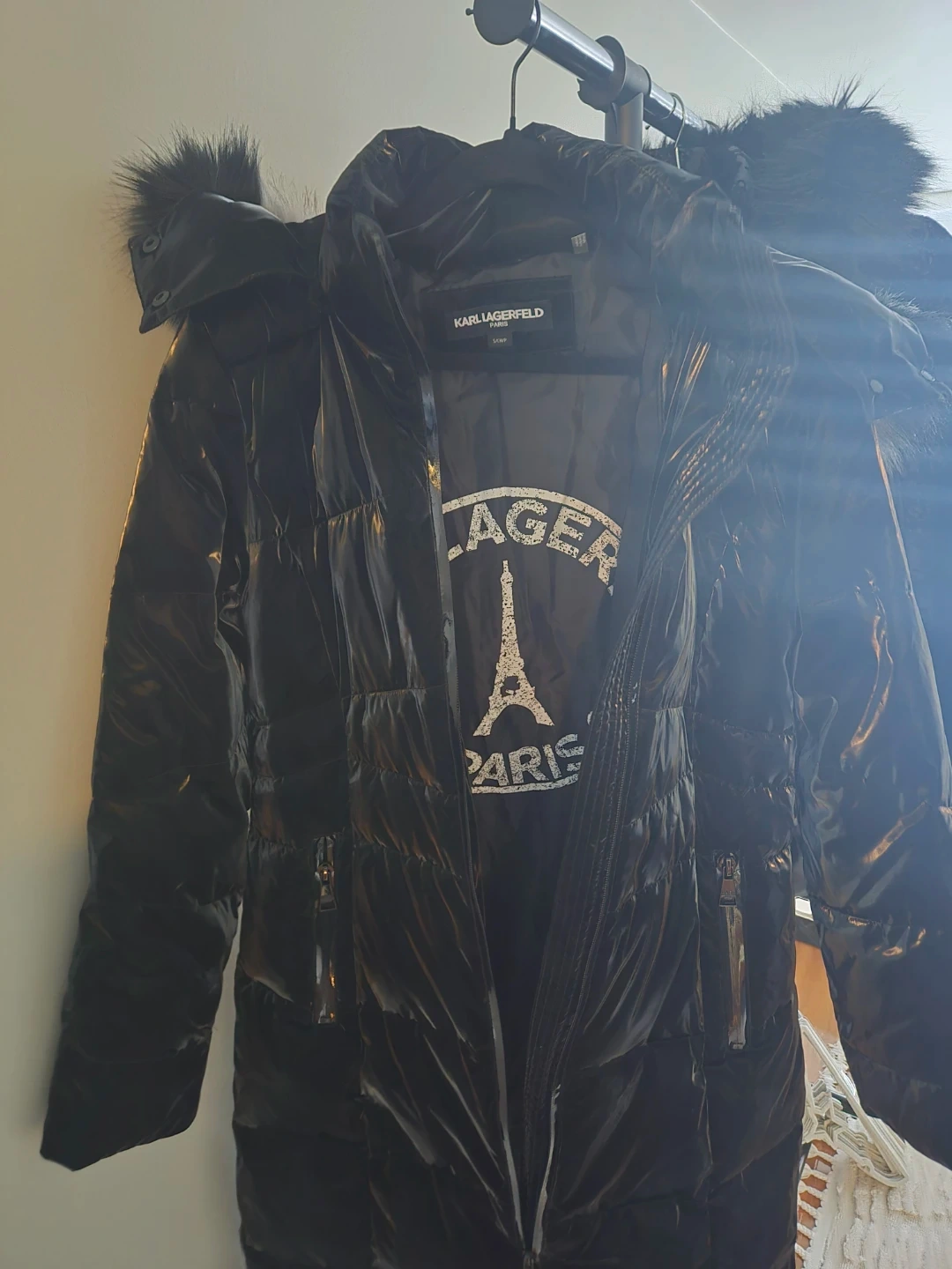 I'm selling a Karl Lagerfeld Paris winter coat in size small. It's a stylish black colour and features a faux fur hood trim. Perfect for keeping warm this winter!