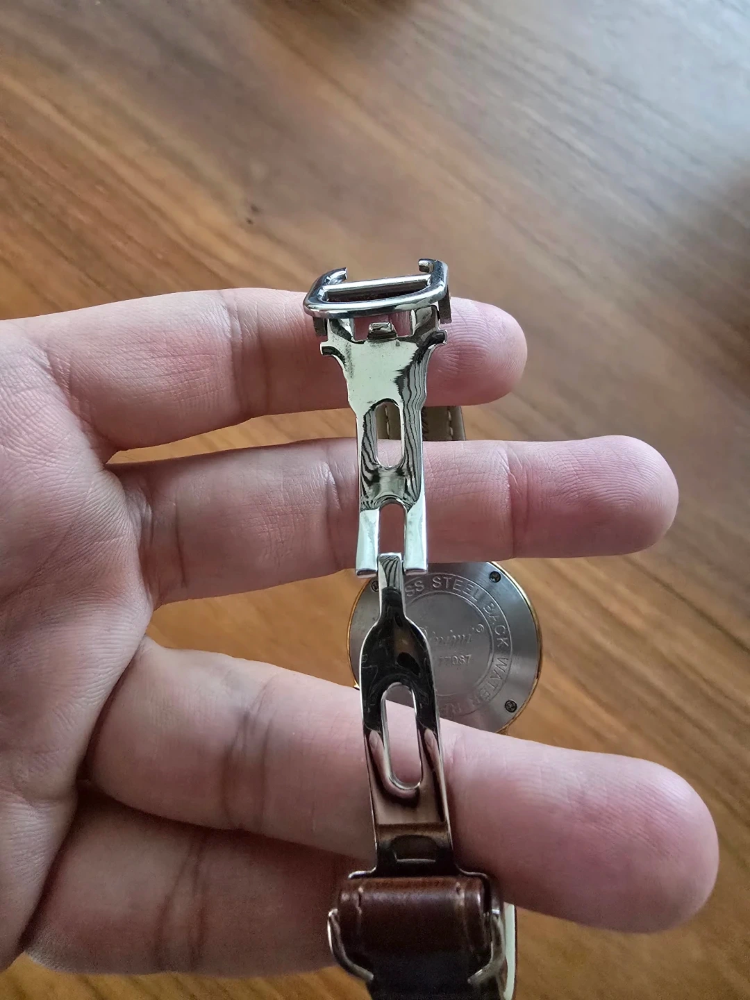 Beautiful Dinimi watch in excellent condition. Features a timeless gold-tone case with Roman numeral dial and a diamond accent on the side, giving it a refined and elegant look. Paired with a brown leather strap that complements both formal and everyday outfits.