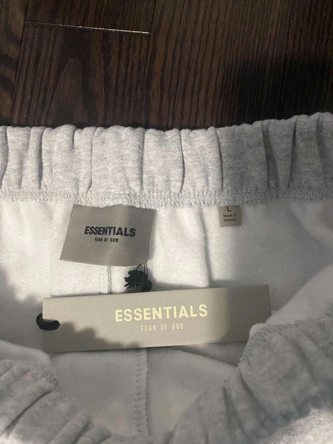 Selling a pair of Essentials Fear of God shorts in size large. They're a light grey colour and made of 80% cotton and 20% polyester. These shorts are super comfy and easy to wear!