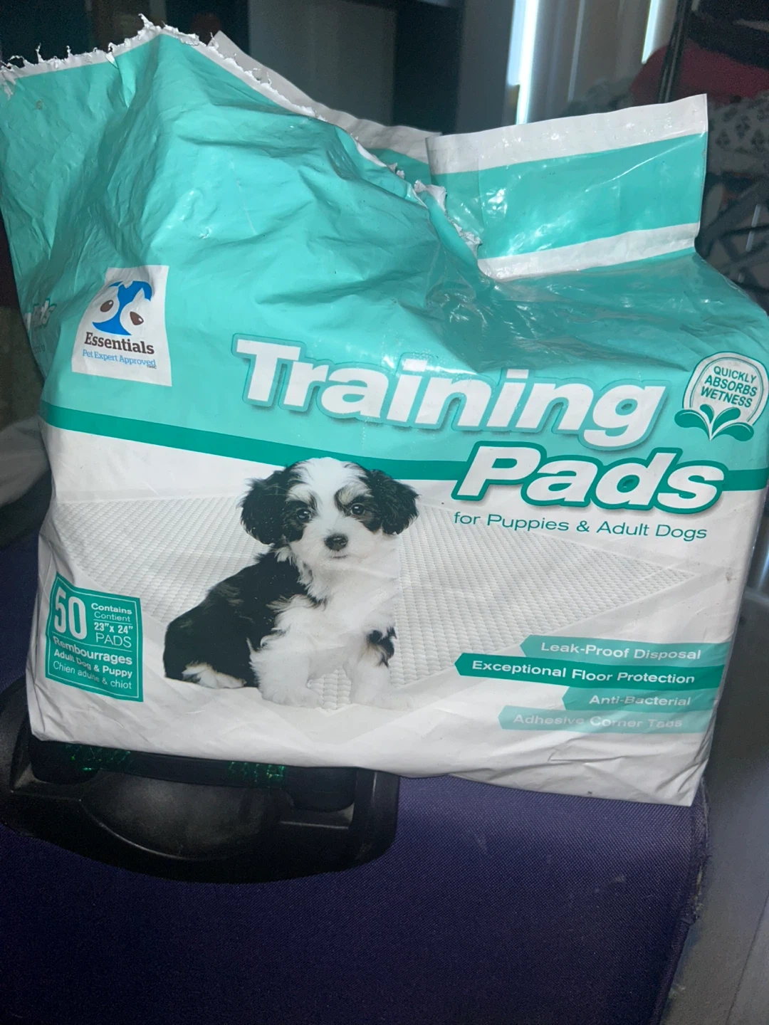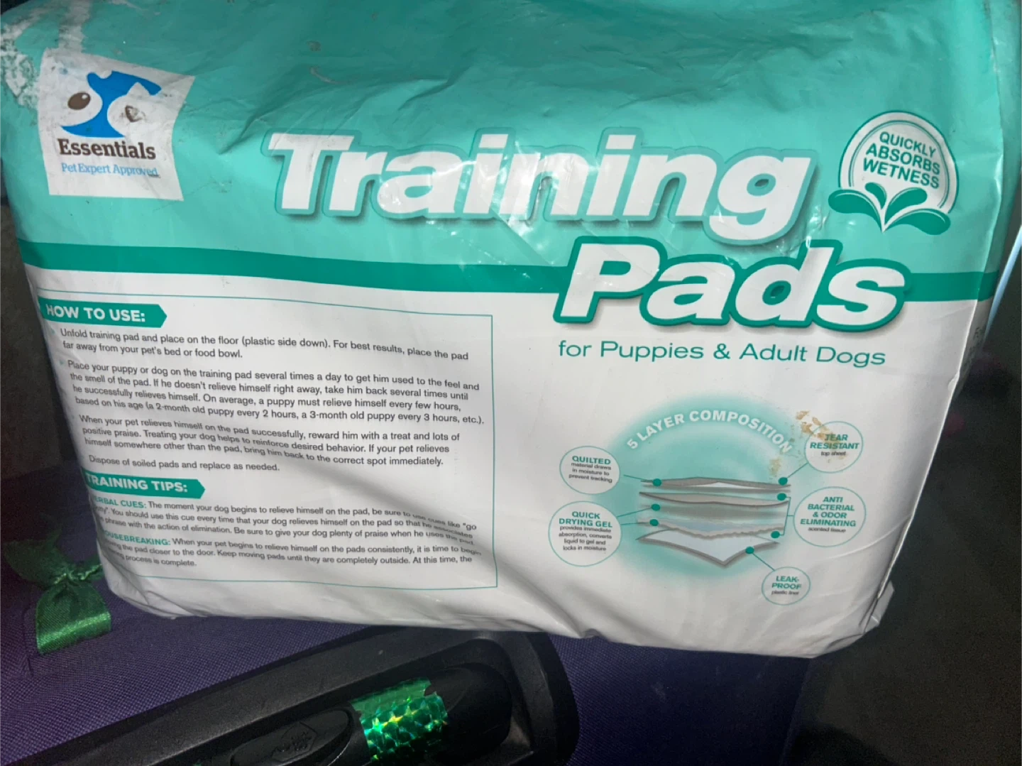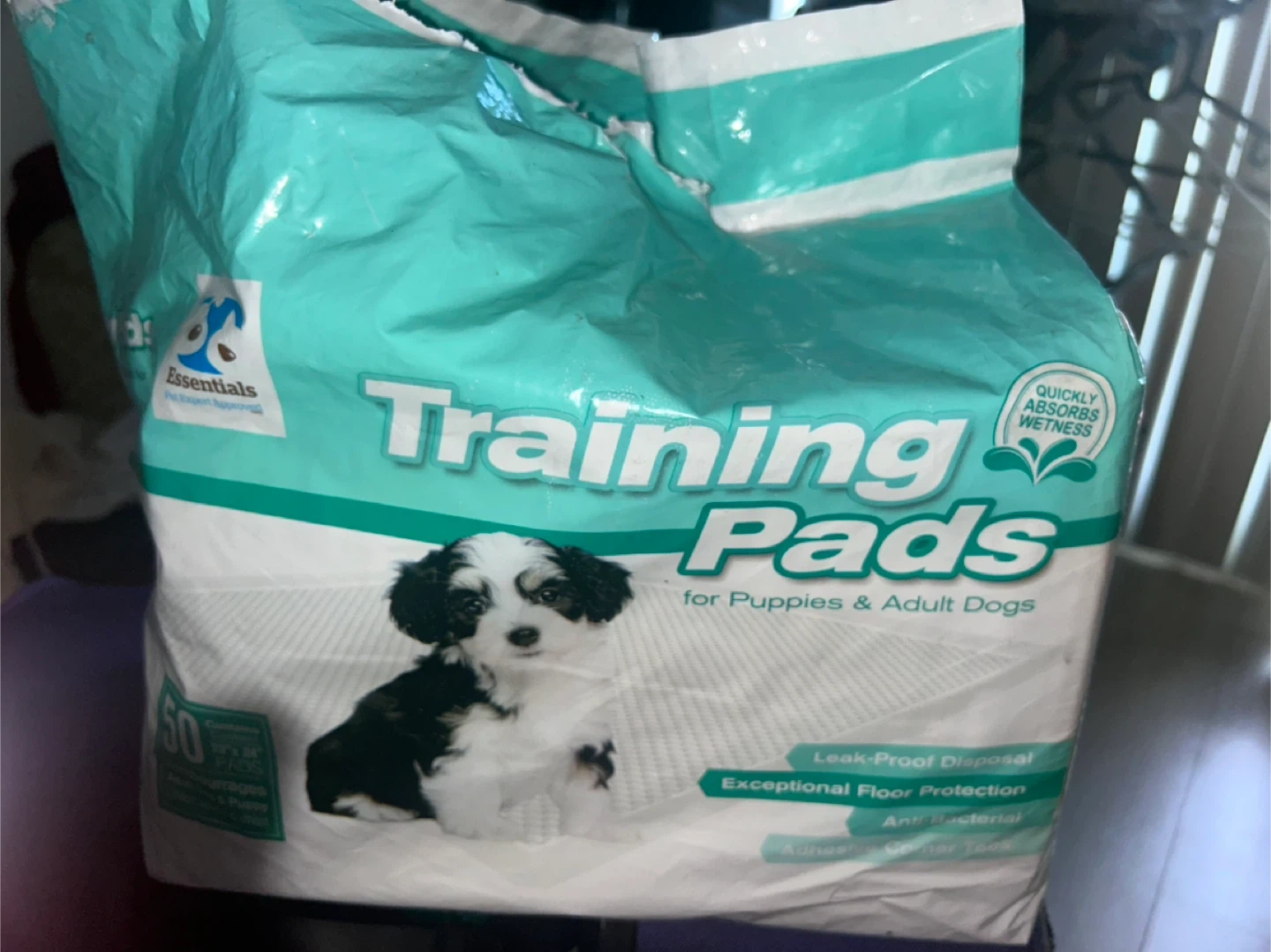 Essentials Training Pads for Puppies & Adult Dogs-pack of 50. These pads are designed for leak-proof disposal and provide exceptional floor protection. They also have adhesive corner tabs and are anti-bacterial. The pads quickly absorb wetness. 7-8 used Pick up bay and temperance