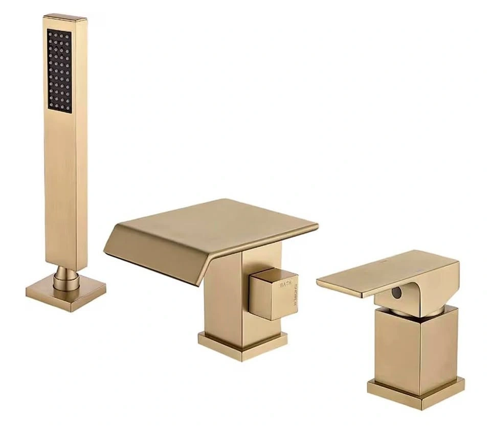 Modern Waterfall Roman Tub Faucet with Hand Shower. Deck mount, widespread 3-hole bath tub faucet set in brushed gold. Pickup at Bathurst and Centre.