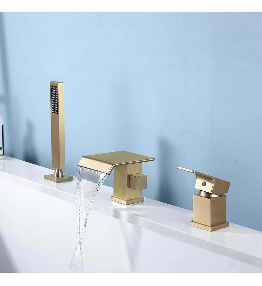 Modern Waterfall Roman Tub Faucet with Hand Shower. Deck mount, widespread 3-hole bath tub faucet set in brushed gold. Pickup at Bathurst and Centre.