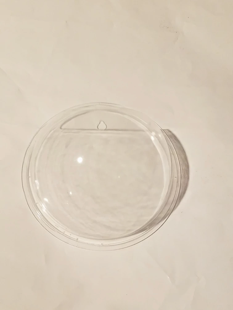 This is a clear plastic sphere designed for hanging plants. It features a convenient loop for hanging. It's made of durable plastic. This sphere is great for small plants or air plants!