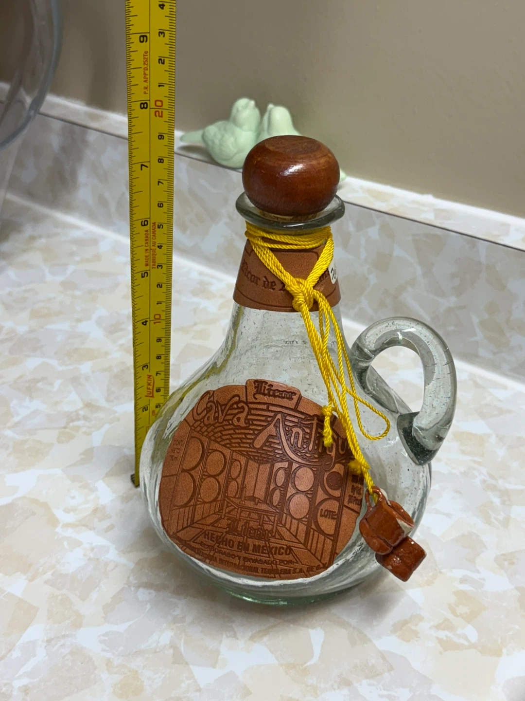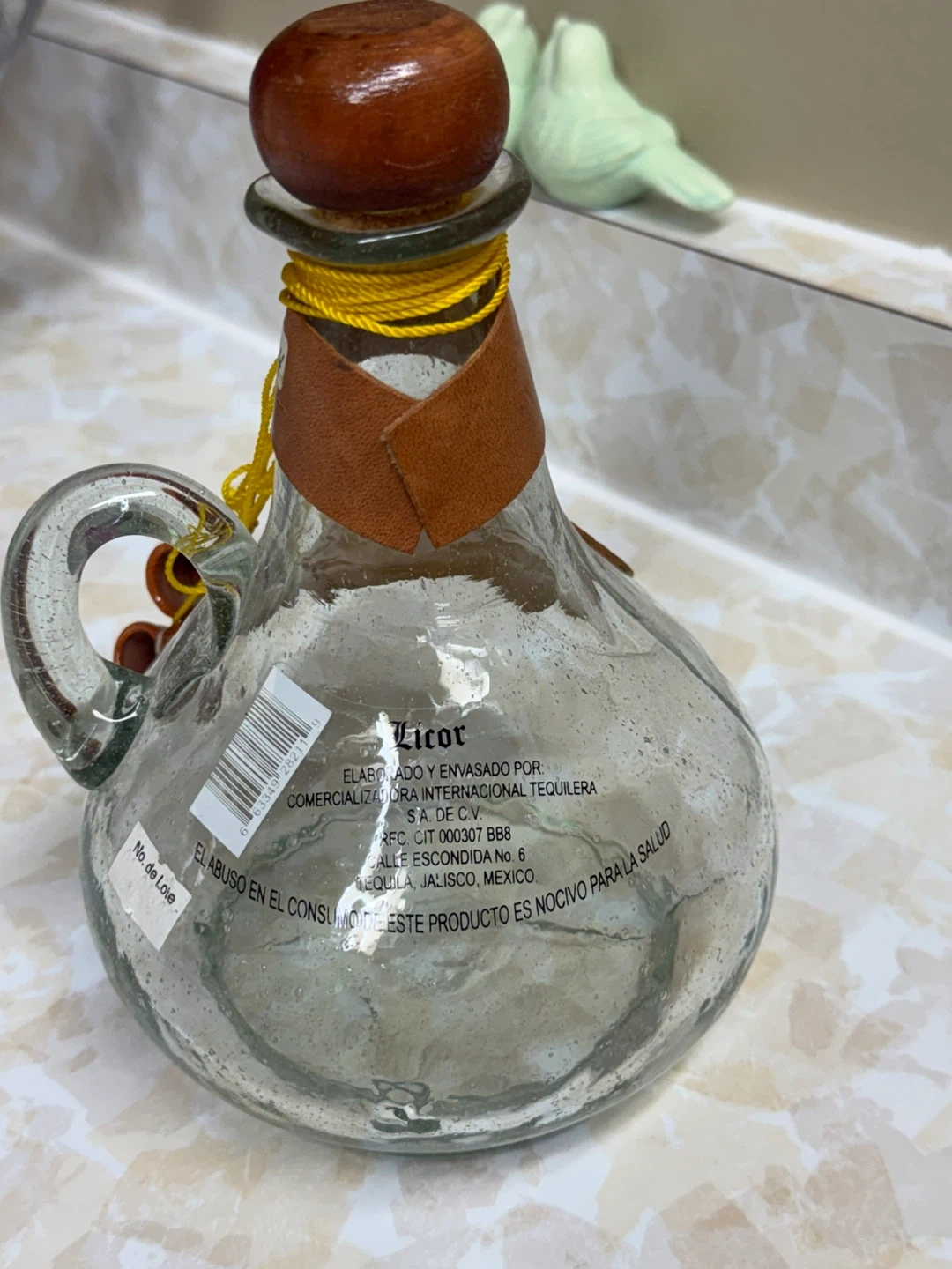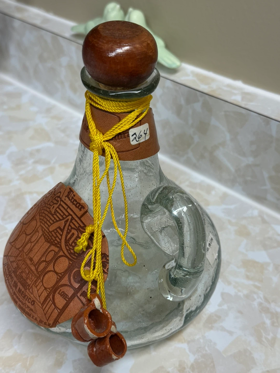 This is an old and decorative Cava de Oro Añejo Tequila bottle that would be a unique addition to any collection or home bar. The bottle has a round, bulbous shape with a wooden stopper and handle, complete with miniature clay mugs. It's definitely a conversation starter!