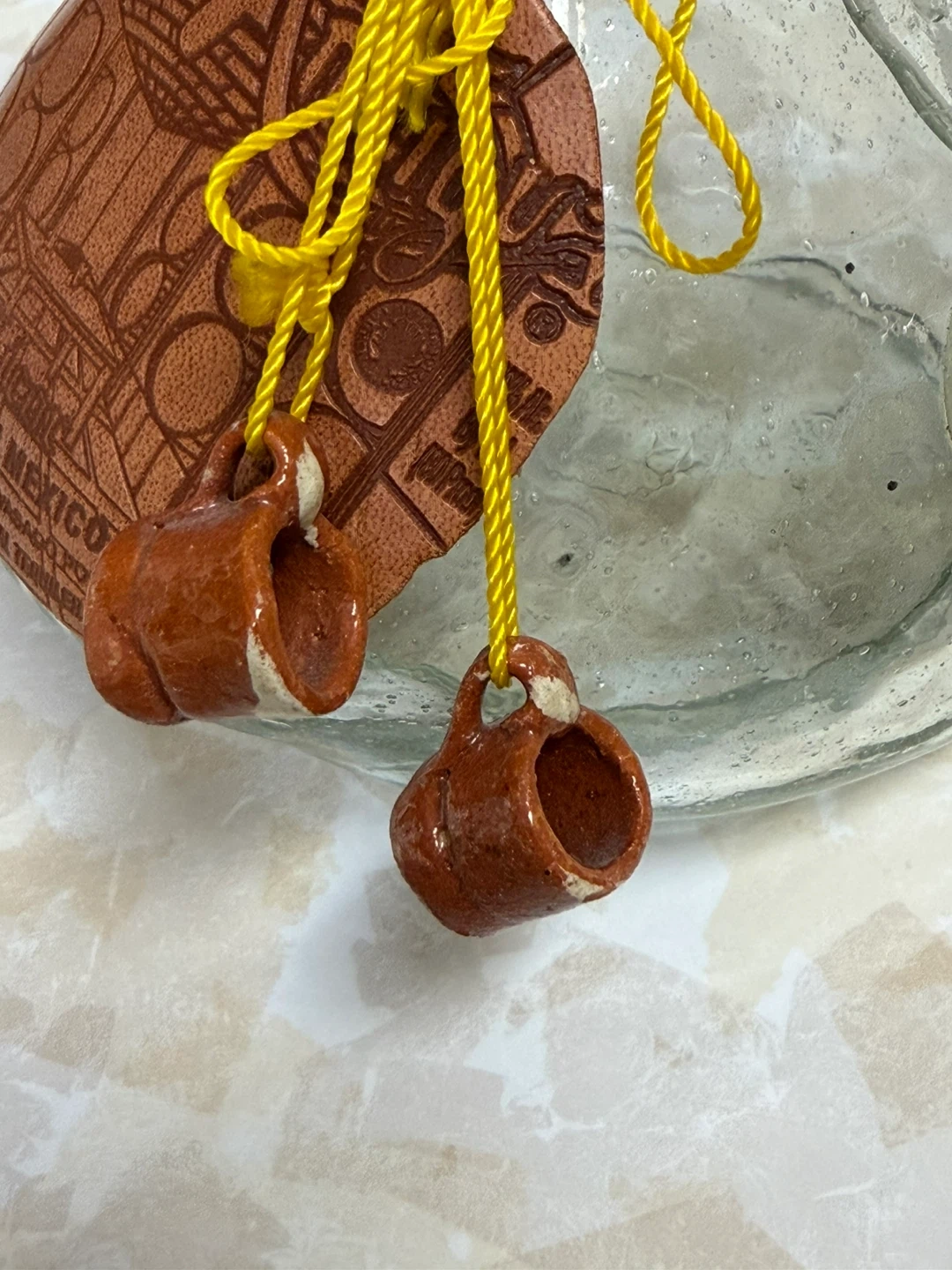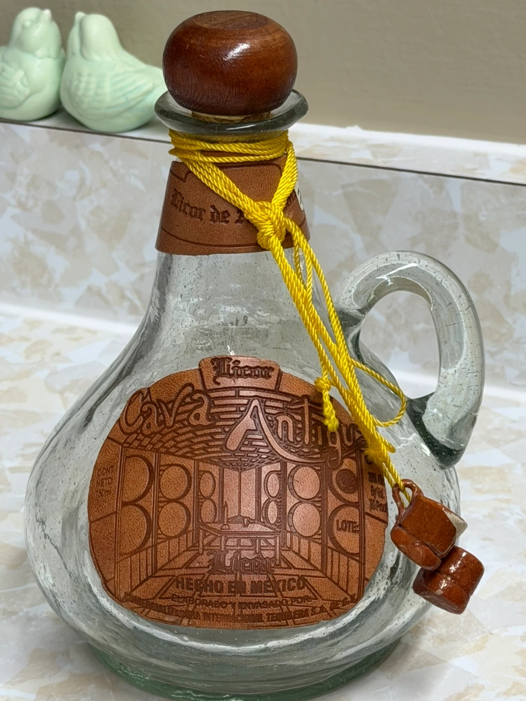This is an old and decorative Cava de Oro Añejo Tequila bottle that would be a unique addition to any collection or home bar. The bottle has a round, bulbous shape with a wooden stopper and handle, complete with miniature clay mugs. It's definitely a conversation starter!